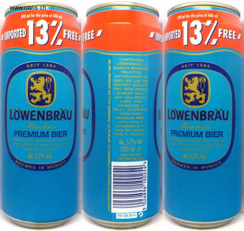 BREWED IN MUNICH VTER TO AN AUTHENTIC MUNICH RECH BREWED IN MUNICH PRING WATER TO AN AUTHENTIC MUNICH RECPE LAGER BREWED FROM THE FINEST BARLEY, HOPS AND 500 ml for the price of 440 ml 500 ml for the price of 440 ml 13% 13% IMPORTED FREE FREE PORTED FREE CONTINUING LÖWENBRÄU'S SEIT 1383 SEIT 1383 MUNICH BREWING TRADITION ESTABLISHED IN 1383, WE USE THE HIGHEST QUALITY TWO-ROW SPRING BARLEY MALT AND HALLERTAU HOPS. THIS PRODUCES A LOWENBRAU U TRULY AUTHENTIC "MÜNCHNER" PREMIUM BIER, | LÖWENBRAU WITH STRICT Münchner Münchner PREMIUM BIER ADHERENCE TO ER PREMIUM BIER THE BAVARIAN PURITY PLEDGE Alc. 5.2% Vol. 500ml e ENED FROM THE FINEST BARLEY HOPS AND SERVE CHILLED SERVE CHILLED Alc. 5.2% Vol. BREWED IN Alc. 5.2% Vel. BREWED IN BEST BEFORF SEE END OF CAN MUNICH R6 CM 06 A 9 LAaER BREWED IN GERMANY BY LOWENBRAU AG. IMPORTED BY UOWENBRAU (U.K) LID, RICHMOND TW9 1BP