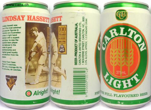 INE FULL FLAVOURED BEER GB Recy LINDSAY HASSETI SETT LTON Lindsay Hassett was one of the most admired and popular figures in Victorian and Australian cricket. A right hand batsman with a superb tochnique, he was the supreme team player who belleved in the values of good sportsmanship and Inspired great loyalty and affection from his players. 1O 100 YEAK YEARS ORCR OPCRICKET 1896-1996 Victoria First Class Record 73 matches, 0825 runs, Average 63.19, 23 centuries, 68 catches. 375ML IGHT OAlright!ight! FINE PULL FLAVOURED BEER BEER-PRODUCT OF AUSTRALIA, CARLTON & UNITED BREWERIES LTD., 1 BOUVERIE STREET, CARLTON, VI., 3053 3.3% ALC/VOL APPROX. 1.0 STANDARD DRINK CA.