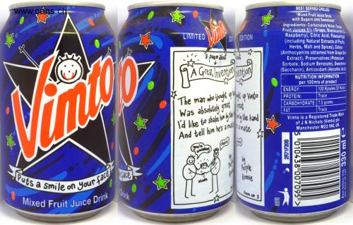And tell him he's a manamate Mixed Fruit Juice Drink Puts a Smile on Your face BEST SERVED CHILLED "Mixed Fruit Juice Drink with Sugars and Sweetener Ingredients: Carbonated Water, Sucea. Fruit Juices 5% (Grape, Blackcurnrant & Raspberry), Citric Acid, Flavourings (including Natural Extracts of Fruis, Herbs, Malt and Spices), Colour (Anthocyanins obtained from Grape Skin Extract), Preservatives (Potassium Sorbate, Sodium Benzoate), Sweetener (Saccharin), Antioxidant (Ascorbic Acid, LIMITED EDIEDITION a poem about wention NUTRITION INFORMATION per 100mls of product 130 Kjoules (31 Kcals ENERGY: PROTEIN: Trace The man who thaugh uqt up Vinto CARBOHYDRATE: 7.5 grams Trace Was absolutey grat at FAT I'd like to shake hn y te a mate hthe hand Vimto is a Registered Trade Mark of JN Nichols (Vimto) plc Manchester M23 9NL UK And tell him he's a mat urs) cheers! Gou're smashing by hrple Ronnie Puts a smile ace shake Drink Poem No 3 Mixed Fruit Juice Drink 2R71F20B 5 "010438 007095> Best before end, 330 ml e