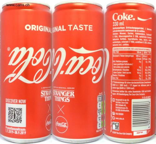 ORIGINA GINAL BUTTON Soft drink containing caffeine. / I Boisson Coke. 330 ml rafraichissante contenant de la caféine. Ingredients: water, sugar, carbonic acid, coloring E 150d, acidifier E 338, natural flavors including caffeine. Ingrédients: eau, sucre, acid carbonique, colorant E 150d, acidifier E 338, arômes naturels including café. NUTRITIONAL DECLARATION / NUTRITIONNELLE DECLARATION 100 ml 330 ml () Calorific value / Valeur énergétique 180 kJ / 594 kJ / 42 kcal 139 kcal (7%) Og (0%) PER / PAR Fett / Matières grasses hereof: saturated fatty acids/ dont acidic grass saturés Carbohydrates / Glucides of which sugar / dont sucres Egg white / Protéines Salt / sel 0g Og (0%) 35 g (13%) 35 g (39% 0g 0g 10.6g 10.6g Og (0%) 0g Og (0%) Reference quantity for an average adult (8400 kJ / 2000 kcal) ./) Apport de référence pour un adult type (8400 kJ / 2000 kcal). Best before: see bottom of the can. Cool and dry to store. Courtesy The Coca-Cola Company. Coke A NETFLIX ORI NETFLIX ORIGINAL SERIES STRAN SIRANGER THIN THINGS 30m Brenwer 594 139 a 19-CH-401408074 DISCOVER NOW X X WH made in the EU. Distribution: Coca-Cola HBC Switzerland AG, Stationsstrasse 33, CH-8306 Brüttisellen. Fet 0g Sated Fetsaie 0848 808000 sugar 359 www.coke.ch CocaC Coke salt PhD period: 1.7.2019-30.9.2019 (aluminum) © 2019 The Coca-Cola Company Z92F19A "Stranger Things" is a registered trademark of Netflix, Inc. and is used with permission. 966000 000677