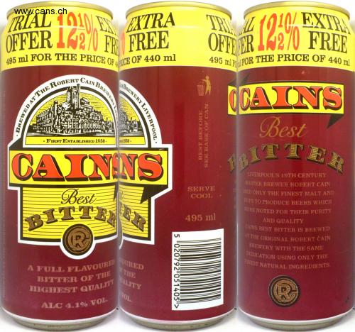 CAINS BEST BITTER IS BREWED FINEST NATURAL INGREDIENTS. AT THE ORIGINAL ROBERT CAIN BITTER OF THE A FULL FLAVOURED BITTER OFFER 14 F FREE DEDICATION USING ONLY THE 495 ml PFOR THE PRICE OF 440 ml 495 ml FOR THE PRICE OF 4 BREWERY WITH THE SAME TR Z OFFE ER 126% 010/ EXTR FREE RIAL 1010 E ATRA EXTRA OFFER 16270 F FREE 'RICE OF 440 ml CAIN OCAINS Best ITTEE FIRST ESTABLISHED 1850 · 1850• CAINNS LIVERPOOL'S 19TH CENTURY MASTER BREWER ROBERT CAIN SERVE COOL USED ONLY THE FINEST MALT AND Best HOPS TO PRODUCE BEERS WHICH WERE NOTED FOR THEIR PURITY BITT 495 ml AND QUALITY. CAINS BEST BITTER IS BREWED AT THE ORIGINAL ROBERT CAIN WOURED THE UALITY TOL ur BREWERY LIVE BREWERY · BREWED AT F CAN BEST BEFORE SEE BASE OF ily 5 "020792 051405 >
