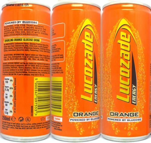 POWERED BY GLUCOSE WHATEVER YOU DO, DO IT WITH ENERGY. Caffeine, Antioxidant (Ascorbic Acid), Flavourings, Colour (Beta Carteb Garotene). THE NUTRITIONAL INFORMATION: Typical values per 100ml: Energy 265 y 265 kJ (62 kcal), THE INGREDIENTS: Carbonated Water, Glucose Fructose Syrup (21%, Sodium Citrate), Preservative (Potassium Sorbate), Stabiliser (Acadla f GLUCOSE. IT'S FOR THAT MOMENT. Orange Juice from Concentrate (5%), Citric Acid, Acidity Regulator Luccade Energy is best when you're active, eating properly and staylng a SPARKLING ORANGE GLUCOSE DRINK WHEN YOU NEED IT MOST. WHEN THE ENERGY AND THE GOODTIMES FLOW. Protein-Trace, Carbohydrate 15.3g (of which sugars 12.5g, of which gluc ich glucose-based bnot for replacing the fluids lost from an upset stomach. And it's not su hidren under 3 years. Find the BEST BEFORE END date on the base of thi of this can, www.LUCOZADEENERGY.COM POWERED BY GLUCOSE THE OW ENERGY 21%), r Meacla Gum), Deta Carotene). elae-Trace, Carbohydrate 15.3g (of which sugars 12.5g, of wi a glucose-based 11.70l. Fat -Nil (of which saturates - Nil), Fibre - Nil, Sodium - Tra Trce. ZADE, LUCOZADE ENERGY and the Arc device are registered trade marte d nars of the BaoSmithKline group of companies. GET IN TOUCH. Write to us at Consumer thasumer Care, SanoSmithKline, FREEPOST, TK2018, Brentford, TW8 9GS, UK. Call us on 080 0 096 3666 fre from your landline) 0r on 0330 123 9447 (cheaper from your mobile) And T OI (ostage necessary) GlaxoSmithKline, Stonemasons Way, Rathfamhan, Du Or al us on 1850 508 509. If you're unhappy, keep hold of this can. ile) And if you're in nhan, Dublin 16, ROI Calories 8% 155 Sugars 35% 31.3g 0% Saturates 0% Nil Salt 3% 0.2g ORANGE ORANGE 250ml e vrrs T3 AL T3AFOSC POWERED BY GLUCOSE Itaying healthy. h ot suitable for aijoy Rt cold. CI2SL.ZORNG01 This 250ml can gives you of an adult's guldellne dally amount MO09087/01 5 "000347"097553> apezoJnT ENERGY