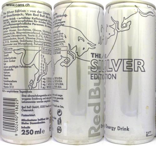 the taste. Red Bull's Wih 100 ml). Not recommended for children, Schw The Silver Edition- from the lime and people sensitive to caffeine. In fashion Ingredients: water, sucrose, glucose, acid reguah Glucuronolactone, inositol, vitamins (niacin, pantofhent Red Bull GmbH, 5330 Fuschonchl am See, Energy drink-increased caffeine content (3rd Citric acid, taurine (0.4%), caffeine (0 in (0.03%), Sodium citrate, magnesium carbonate), carbonic acid, sows 100 ml enho included B6, B12), flavors, stabilizer (sucrose celtilate butyrate, silver edition-from the Lime imette de effect. (32 mg / Μiνangere (32 Consume quantities. h moderate rewagulator sdure, sows antorhenic acid, mocolatisobutyrate, lon blue FCF). Glycerine ester from root resin), dye (Brilo Nutritional values Calorific value protein carbohydrates of which sugars Fet of which saturated fatty acids Fiber sodium Vitamins: niacin Pantothenic acid Vitamin B6 Vitamin B12 192 k 45 45 kcal) 0g 11 g 11 8 0g 0g THE E SIILVER 0.04 EDITIOTION 8 mg / 50% / 50% RDA 2 mg / 33% / 33% RDA 2 mg / 143% D / 143% RDA 2 pg / 80% D / 80% RDA RDA Recommended Daily Allowance e and A varied and op balanced diet and elne gud he healthy Lifestyle are recommended. Fuchl Red Bull GmbH, 5330 Fusdch on out at sea, Austria Pasteurized. Best before blah See can bottom. EM energy drink Contents: 250 mle TATT 9 002490 218225 SR12H098