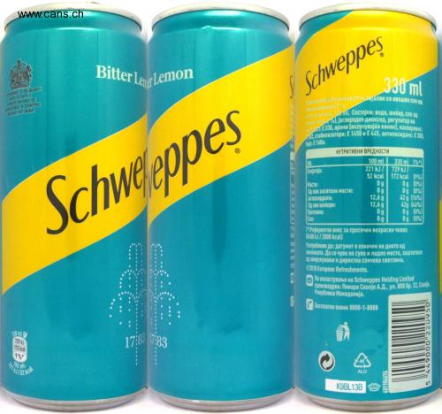 Оrескителен безалкохоленвијалак со овошен сок ОД околиснна: 380 пil. Состојки: вода, шекер, сок од НО HR jarлероден диоксид, регулатор на орет Е 330, ароми (вклучувајќи кинин), конзерванс: Schweppes 330ml Bitter Le Lemon PONTMENT TO HER MAJESTY DUEEN ELIZABETH SOWEPPES HOLDINGS LTD ANACTURERS OF SCHWEPPES AN ROSES SOFT DRINKS ANMON HHHMMYH 2 % нна il. Cостојки: вода, шеќер, сок ол . стабилизатори: E 1450 и Е 445, антиоксиданс: Е 300 foja: E 160a. НУТРИТИВНИ ВРЕДНОСТИ 100 ml 330 ml (%) 221 kJ/ 729 kJ/ 52 kcal 172 kcal (9%) 0g 0g B0: Enveprwja: Schweeopes | Масти: Од КоИ заситени масти: Jarлехидрати: Од кои шекери: Протеини: Con: 0g (0%) 0g (0%) 42g (16%) 12,69 12,6 g 0g 42g (46%) 0g (0%) 0g Og (0%) ПРеферентен внес за просечен возрасен човек 8400 kJ/2000 kcal) Ллотребливо до: датумот е означен на дното од ЛИменката. Да се чува на суво и ладно место, заштитено Д замрзнување и директна сончева светлина. ©2018 European Refreshments. По овластување на Schweppes Holding Limited произведува: Пивара Скопје А.Д., ул. 808 бр. 12, Скобда, Реnублика Македонија. U С Бесплатен повик 0800-1-8888 30 ml 729 kJ 172 kcal 9% 100 m kcal 17:88 7:83 ALU K9BL13B 401104676 OS6022 000677I
