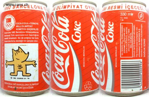 OLIMPİYAT OYUN 1992 BARCELONA O COCA-COLA 19 2 BARCELONA OLIMPİYAT COLİMPIYAT OYUN RIRESMİ İÇECEĞİ 330 m OLIMPITAT TS 4080 T.M. ÇEVREMİZİ KORUYALIM COCA-COLA -TÜRKİYE MİLLİ OLİMPİYAT KOMİTESİ GÜÇBİRLİĞİ 1908 Coca-Cola 1992 Barcelona Olimpiyatlarına katılacak Türk sporcuiarının hazırlığına destek olmaktadır. Siz de içtiğiniz her kutu Coca-Cola ile bu desteğin bir parçası olun. MA © 1988 COO92. S.A TM COCA-COLA 1992 BARCELONA OLIMPIYAT OYUNLAP' RESMİ İÇECEĞİDİR. Coca-Cola ve Coke The Coca-Cola Company'nin tescilli markalarıdır TURKITE KOMITESI Coke MÜSECCEL MARKALAR Coke MÜSECCEL MARKALAR SU, ŞEKER, CO2, RENKLENDİRİCİ (KARAMEL), FOSFORİK ASİT, COCA-COLA ÖZÜTÜ, KAFEİN (EN ÇOK 0,150 G/L.)' DEN IMAL EDİLMİŞTIR. Dolum tarihi kutunun altındadır. The Coca-Cola Company' nin müsaadesi ile MAKSAN A.Ş. 966000 000677 İstanbul tarafından kutulanmıştır. SOĞUK İÇİNİZ