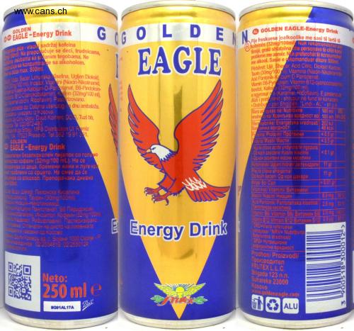 lodea Secer, Limunska Kiselina, Ugljen Dioksid, tord B12-Cijanokóbalamin), Caffeine (32mg / 100 ml), me alcohol. Recommended daily amount 500ml. heart problems. It is not preferred to be consumed colored (Caramel Riboflavin). Pasteurized children, pregnant women and persons who have Ingredients: Water, Sheer, Citric Acid. Carbon Dioxide Non-alcoholic soft drinks with high amounts of Taurine (30mg / 100). Vitamins (Niacin-Nicotinamide Vitamin B6-Pyrioxin. Vitamin B12-cyanocobalamin emKomeri ad, s. Bojane 1000 Skopje - R. 100ml), Ne preporučuje se deci, trudnicama, 0ng 100 ml), Inositol. Vitanini (Niacin-Nicotinamide, atKiselina-Calcium-D-Pantothenate, B6-Pyridoxine- Energy Drink GGOLDE O GOLDEN EAGLE-Energy Drink GOLDEN EAGLE-Energy Drink OG N. Non-alcoholic refreshing drink with high amount of Dofeine (32mg / 100ml Not recommended CINE 0sobama sa srcanim tegobama, Ne ule se consumiranje sa alkoholom ma dose max. 500ml. Voda Secer, Limunska Kiselina, Ugljen Dioksid mo 100 ml). Inositol, Vitanini (Niacin-Nicotinamide ADEM Ingredients: Water, She er, Citric Acid. Karion dioxide Pantonic Acid-Calcium D Pantothenate Ihositol, Caffeine (32mg / 100 ml). eamel obični. Riboflavin). Pastarizovano. euotrebit do: Datuma utisnutog na dnu packing, beteno i uvezeno iz Kosova. for Cmu Goru: Dauti Komerc DOO, Tuzi bb, a Tel 020 / 872-480 nk for Serbia: MFB Distribution UI. Ramiz L104 17523 Presevo Tel.062 19 91 391. GOLDEN The expiration date printed at the bottom of the can • Distributor for Albania: "Lindi-AL" -sh.p.k Vlera us gyese ne / Nutritivne vredng nal Xpanlive value in 100ml Viera alorikel Energy value 202 kJ Caloric value Prateinal Protein / npotenHn ndyral Mastil MacTH Of which saturated fatty acids 0d kojih zasičene masne kiseline FROM WHICH saturated fatty acids Carbohydrates Ugljeni hydrate / Jarnexnapat 11 gr Of which shegernal Od kojih šećeri OA KON wekepn Kriper Scl Con Vitamins Vitaminil BHtaMMHM Niacin Niacin / HwauWH Pantonic Acid / Pantothenic acid 2.0 mg 33% 100 ml DRD 48 kcal <0.5 gr <0.5 gr OEAGLE-Energy Drink Bodyless soft drinkA large alcoholic beverage ECTBO KOCDEWH (32mg / 100 mL). He ce for children. pregnant women and people co heart problems. It must not be ra with alcohol. Recommended lounge 500ml <0.1 gr 11 gr <0.01 gr Water Sugar Citric Acid ONCMO TayonH (30mg / 100ml) 8.0mg 50 MELCIUM Pantothenate B6 Pyridoxine danaH) VHOaiNTon. KopevH (32mg 100ml adekel Riboshlavin). Pasteurized Removed at the bottom of the cans VeeseH on KocOBO mКомерцад с. Boene 1000 SKope aegoHa 02 2534819: 02 2550124 amin B6 Vitamin B6 / BHTAMAH 66 2.0mg 143 mn 812 Vitmain B12 / BHTAMMH 512 20ug 80 ORD Reference value shayese / NRV = Nutritive Reference Value / Drone Nutrition D8ferential value Produces / Proizvodi / Manufacturer FRUTEX L.L.C. Brigada 123 n.n. Suhareke 23000 Kosovo www.goldeneagle.com 20.com.mk. Net: 250 mle forefront ALU IG1AL17A 3 900518 300012>