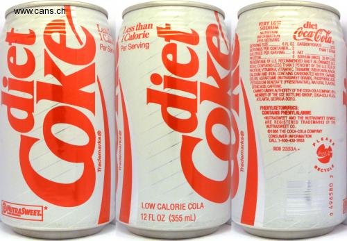 PERCENTAGE OF U.S. RECOMMENDED DAILY ALLOWANCES (US. SERVING SIZE... 6 FL OZ CARBOHYDRATE. LESS PROTEIN, VITAMIN A VITAMIN C, THIAMINE, RIBOFLAVIN, NIACIN, CALCIUM AND IRON. CONTAINS CARBONATED WATER, CARAMEL RDA): CONTAINS LESS THAN 2 PERCENT OF THE U.S. RDA OF VERY LOW SODIUM dict Coca Cola Less Less than 1Calorie 1Ca NUTRITION INFORMATION PER SERVING Per Serving Per Ser 6 FL OZ CARBOHYDRATE. LESS SERVINGS PER CONTAINER... 2 CALORIES PER SERVING.. 0 FAT PROTEIN. PERCENTAGE OF U.S. RECOMMENDED DAILY ALLOWANCES E THAN 1 GRAM 0 SODIUM (MGS) 35 OR LESS COLOR, ASPARTAME (NUTRASWEET BRAND), PHOSPHORIC ACn POTASSIUM BENZOATE (PRESERVATIVE), NATURAL FLAVORS CITRIC ACID, CAFFEINE CANNED UNDER AUTHORITY OF THE COCA-COLA COMPANY, BY A MEMBER OF THE CCE BOTTLING GROUP, COCA-COLA PLAZA ATLANTA, GEORGIA 30313. PHENYLKETONURICS: CONTAINS PHENYLALANINE •NUTRASWEET AND THE NUTRASWEET SYMBOL ARE REGISTERED TRADEMARKS OF THE NUTRASWEET CO. ©1986 THE COCA-COLA COMPANY CONSUMER INFORMATION CALL 1-800-438-2653 PL ROB 2353A• CocaCola PECYCLE ONUTRASWEET LOW CALORIE COLA 12 FL OZ (355 mL) Trademarks® Trademmarks@ Trademarks® 2.