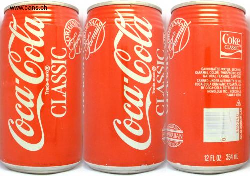 Coke CLASSIC CARBONATED WATER, SUCROSE, CARAMEL COLOR, PHOSPHORIC ACID NATURAL FLAVORS, CAFFEINE CANNED UNDER AUTHORITY OF THE COCA-COLA COMPANY, ATLANTA, GA. BY COCA-COLA BOTTLING CÓ. OF HONOLULU INC., HONOLULU, HAWAII 96819. Made vilh Pu HE HAWAIIAN SUGAR 12 FL OZ 354 ml Trade-mark® CLASSIC Trade-mark CLASSIC CANE ALL-ALUMINUM CAN