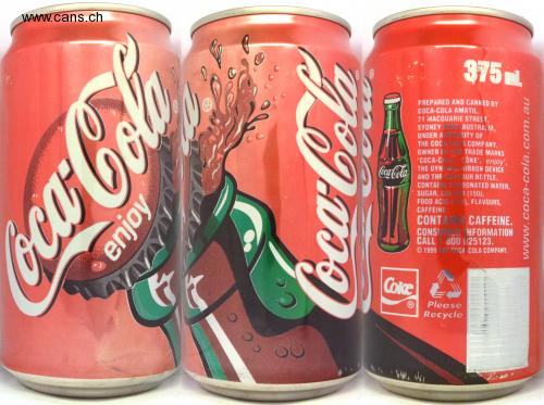 375L PREPARED AND CANNED BY COCA-COLA AMATIL, 71 MACQUARIE STREET, AUSTRALIA, SYDNEY UNDER ASRITY OF THE COC I COMPANY, OWNER A TRADE MARKS "COCA-C THE DYN HIBBON DEVICE AND THE C T OUR BOTTLE. CONTAIS BONATED WATER, SUGAR, CO 3 (150), FOOD ACID CAFFEINE. COKE', enjoy', Coca-Cola ), FLAVOURS, CONTA CAFFEINE. CONSU NFORMATION CALL 800 U25123. © 1999 THE COCA COLA COMPANY. Coke Please Recycle ca-Cola enjoy www.coca-cola.com.au