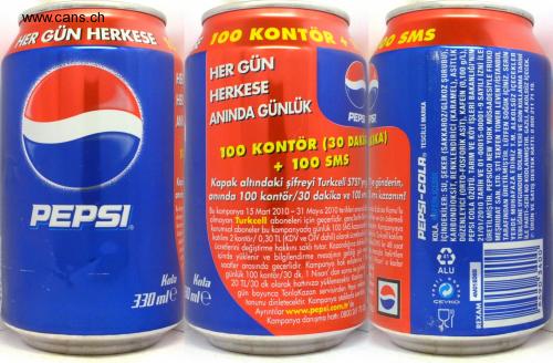 katılım 2 kontör/ 0,30 TL (KDV ve ÖÏV dahil) olarak ücelendi Lurkcell kahlım içinde yüklenir ve bilgilendirme mesajının geldiği gi eida belirtilen kurumsal aboneler bu kampanyada günlük 100 SMS kozanoa r Kampanyaya 20 TL/30 dk olarak hattınıza yüklenecektir. Kalma saatler arasında geçerlidir. Kampanya hak edijemnaI Non a kadar Ayrıntılar www.pepsi.com.tr'de 100 KONTÖR HER GÜN HERKESE DO SMS HER GÜN HE HERKESE AW ANINDA GÜNLÜK PEPS 51 100 KONTÖR (30 DAKI IKA) +100 SMS Kapak altındaki şifreyi Turkcell 5757 p e gönderin, anında 100 kontör/30 dakika ve 100m iams kazanın! PEPSI Bu kampanya 15 Mart 2010 - 31 Mayıs 2010 tarihlei arasti abize Kamu'lu olmayan Turkcell aboneleri için geçerlidir. gençlariler leve ön ödemeli ücretlerini değiştirme hakkını saklı tutar. Kazandiğımz da As ler 48 saat hak edislenin I gunlük 100 kontör/30 dk, 1 Nisan dan sonra ise 20 TL/30 dk olarak hattınıza yüklenecekir Ki satler arasında geçerlidir. Kampanya Nsan a kadar 41 Kola Kola ALU 330 mle ne ÇEVKO Kampanya danışma hatt: 08002170 PEPSI-COLA, TESCİLLİ MARKA KOLA. AFEİN İÇERİR. 0:E İÇİNDEKİLER: SU, ŞEKER (SAKKAROZ/GLİKOZ ŞURUBU), KARBONDİOKSİT, RENKLENDİRİCİ (KARAMEL), ASİTLİK DÜZENLEYİCİ (ORTO-FOSFORİK ASİT), KAFEİN (0,100 g/L), PEPSI COLA ÖZÜTÜ. TARIM VE KÖY İŞLERİ BAKANLIĞI'NIN 21/01/2010 TARİH VE 01-00015-00001-9 SAYILI İZNİ İLE ÜRETİLMİŞTİR. PEPSICO NEW YORK MÜSAADESİYLE FRUKO MEŞRUBAT SAN. LTD. ŞTİ TEKFEN TOWER LEVENT/İSTANBUL TARAFINDAN ÜRETİLMİŞTİR. LÜTFEN SOĞUK İÇİNİZ. SERİN YERDE MUHAFAZA EDİNİZ T.M. ALKOLSÜZ İÇECEKLER TEBLİĞİNE UYGUNDUR. DOLUM YERİ VE SON KULLANMA TARİHİ İLE PARTİ-SERİ NO KODLANMIŞTIR. GAZLI, ALKOLSÜZ İÇECEK. OÜRÜN VE SATIŞ DESTEK HATTI: 0 800 211 71 19. 4M01 E06B REXAM 00