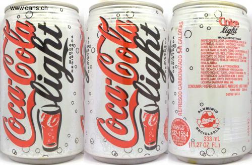 Coke light MARCA REGISTRADA INGREDIENTES: AGUA CARBONATADA, ÇOLOR DE CARAMELO, ACIDOS FOSFORICO Y CITRICO COMO ACIDULANTES, ASPARTAME Y ACESULFAME-K (0,04% COMO EDULCORANTESI, SABORIZANTES (INCLUYENDO CAFEINA) Y BENZOATO DE SODIO (MENOŞ DE 0,02% COMO PRESERVANTE). FENILCETONÚRICOS: CONTIENE S FENILALANINA. ENLATADO BAJO LA AUTORIZACIÓN DE THE COCA-COLA COMPANY POR COCA-COLA PUERTO RICO BOTTLERS, CARRETERA NÚM. 75, INTERSECCIÓN CARRETERA NÚM. 1, BARRIO MONTELLANO, CAYEY, PUERTO RICO 00736. LICENCIA SANITARIA NUM. 549. CONSUMIR PREFERIBLEMENTE ANTES DE: VER FONDO 1996-3993 330 ml ㅇ 209001641A 00 0 0 ㅇ ALUMINIO Atención Coca-Cola Coca-Cola 50 532-1554 V1-200-1156 desde el interior sin cargos CICLABL 333 mL (11,27 OZ. FL.) ㅇ REG MAR onue ap Consumidor REFRESCO CARBONATADO ŚIR CALORÍIAS 067667 ©1997 THE COCA-COLA COMPANY