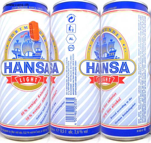 n Vergleich zu Bier mit alc. 5,2 % vol/44 kcal. je 100 ml .e 0,51 alc. 2,6 % vol DORTMUNDER HANSA LIGHT DIR E GERMANY UNDE HANSAA KIGHT 7 HANSA LIGHT Brewed according to the German Reinheitsgebot D 52 C @ O R MI DESCHAUER 40 % weniger Kalorien ER Deutschen Reinh lorien Reinheitsgebot 100 ml ENTHALTEN: 108 kJ (26 kcal), 2,6 % alc. 2,0 g VERTWERTBARE KOHLENHYDRATE SCHANKBIER FOR FINLAND: SKATTEKLASSE I *1oyo MINDESTENS HALTBAR BIS ENDE: SIEHE BODEN DORTMUNDER HANSA-BRAUEREI GMBH 4 001982 003535 0% less calories 50% less alcohol BEER BIERE BIRRA LEGGERA · CERVEZA · ORIGINAL BRAUEREIFÜLLUNG · BREWED AND CANNED BY · BRASSÉE ET MISE EN BOITE PAR · PRODOTTA E INSCATOLATA DALLA · ELABORADA Y ENLATADA POR: DORTMUNDER HANSA-BRAUEREI GMBH, DORTMUND/GERMANY BEST BEFORE: SEE BASE OF CAN · A CONSOMMER DE PRÉFERENCE AVANT: VOIR LA DATE AU FOND DA CONSUMARSI PREFERIBILMENTE ENTRO: VEDI DATA SUL FONDO CONSUMIR PREFERENTEMENTE ANTES DE: VER FECHA DEBAJO TEN MINSTE HOUDBAAR TOT: ZIE DATUM ONDERKANT · FOR SWEDEN: CAT II MAX. ALC. 2,8 % VIKT, MAX. 3,5 % VOLUME