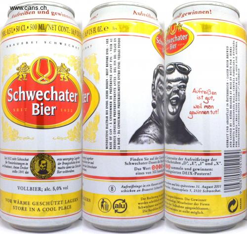 STORE PROTECTED FROM HEAT Open up and win Put the tear-off rings in an envelope and by August 31, 2001 at the latest Find the pull rings on the bottom bottom of the d informed. Company employees excluded from participation. the profit is not possible. NHE: 0.5L 50 CL 500 ML / NET CONT: 169USR Collect the word D @ 00 00 and win: Schwechater doses the letters "D", "E", "I" and "X". send to Schwechechat Brewery, Alanovaplatz 5, 2320 Schwechat. The judges' decision is closed. The winners STORE IN A COOL PLACE made the Scraadr Scbwecbater with it win Excitement d win! Sch kehwechselater Schve Beer· iCHAT Schwechater he Rip is good, beer because man SINCE 1632 gowinnen does! Scbwecbat has lived since 1632 fir pioneering achievements in e art of brewing. Anton Dreber first under-fermented Lageha lager the brewing report be e be and made the Stra Scrwecbater with it World famous beer. ANTON Collect the word OGU PU0 and win: ines of 300 hand-signed DEIX posters! provided that in 1841 VOLLBIER; alc. 5.0% vol 8th. The legal process is are in writing Schwechater are from The cash redemption of the Co Locked out. The winners ntigen. Company employees AGERN alu AT LEAST BEFORE THE END: SEE GROUND BEST BEFORE END: • SEE BASE OF CAN A CONSOMMER DE PRÉFÉRENCE AVANT FIN: • VOIR AU DESSOUS CONSUMIR PREFERENTEMENTE ANTES • DEL FIN DE: VEASE EN LA BASE - DA CONSUMARSI PREFERIBILMENTE ENTRO FINE: VEDASI FONDO BROWN AND BOTTLED IN AUSTRIA LAGER BEER BR EWED AND CANNED BY BIÈRE BRASSÉE ET MISE EN BOÎTE PAR • BIRRA PRODOTTA E CONFEZIONATA DALLA CERVEZA FABRICADA Y ENVASADA POR GYÀRTJA BRAU UNION ÖSTERREICH AG, A-4020 LINZ, AUSTRIA. CONTENENTE ANTIOSSIDANTE ACIDO- -ASCORBICO REXAM
