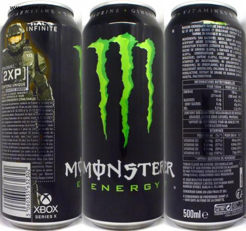 INGREDIENTS: CARBONATED WATER, SUGAR, GLUCOSE SYRUP ACIDITY CORRECTOR (SODIUM CITRATES), EXTRACT OF CARBONATED ENERGY DRINK ENRICHED WITH VITAMINS B, B TAURINE, GINSENG AND L-CARNITINE. RONOLACTONE, GUARANA SEED EXTRACT (0.02% GINSENG ROOT (0.08%), L-CARNITIRE L-TARTRATE ACIDIFIER (CITRIC ACID), FLAVORS, TAURINE (0. BENZOIC), CAFEINE (0.03%), COLOR (ANTHOCYANES PYRIDOXINE), B2 (RIBOFLAVIN), B12 (CYANOCOBALAMINE B2 AND B12 WITH SUGARS AND SWEETENER. CONTAINS SWEETENER (SUCRALOSE), SODIUM CHLORIDE, D-GLUC VITAMINS [B3 (NICOTINAMIDE), B6 (HYDROCHLORIDE (0.04%), PRESERVATIVES (SORBIC ACID, ACDE AURINE + GINSEN ENER GY ARNITINE CARNITINE + T VITAMI NES URINE HALS INFINITY WONSTER-SNERGY® 117 UNLOCK 2XP] SWEETENER (SUCRALOSE), SODIUM CHLORIDE D AND ONE INOSITOL, MALTODEXTRIN. UNIQUE CONTENT MONSTER ENERGY NUTRITIONAL INFORMATION FOR 100ml FOR 500 ml (% WITH ENTER THE REGISTERED CODE UNDER THE OPERCULE ON MONSTERENERGY.COM/HALO reserved for persons residing in France (including isFanases) 18 years of age or older. Promotional codes iiles between 01.10.2020 and 31.12.2020 or until are in stock. Register the code found online bobbin opening slam before 03.31.2021. hr register and know all the terms and conditions, ualtez www.monsterenergy.com/halo. Each code pntinel gives access to 1 token of 2XP, which doubles the it is the experience acquired for 30 minutes from cross-referencing the code in public areas leer online game. In addition, the first 8 codes that DO NOT grant you access to in-game content. h UR max. 60 hours recoverable by Microsoft account you are promoting. Codes and game content have an internet connection and Halo Infinite (available at e a on Xbox consoles requires Xhox Live Gold ENERGY 156 kJ (37 kcal) 9.4g 8.4g 0.21g CONTAINS NEGLIGIBLE AMOUNTS OF MATERIALS FAT, SATURATED FATTY ACIDS, PROTEIN. * REFERENCE CONTRIBUTION FOR A TYPICAL ADULT (8400 kJ / 2000 kcal) 780 kJ (185 kcal) (9%) 47g (18%) 42g (47%) 1.1g (18%) CARBOHYDRATES WITH SUGAR SALT VITAMINS FOR 100 ml (% **) | FOR 500 ml (% ") VITAMIN B3 8.5mg (53%) 0.80mg (57%) 0.70mg (50%) 2.5µg (100%) ** DAILY REFERENCE CONTRIBUTION 43mg (26%) 4.0mg (26%) 3.5mg (250%) 13ug (500%) VITAMIN B6 VITAMIN B2 VITAMIN B12 (memberships sold separately). Promo- managed and admin- recorded by Monster Energy Europe Limited. MIMONSTER HIGH CAFFEINE CONTENT, NOT RECOMMENDED FOR CHILDREN AND PREGNANT OR BREASTFEEDING WOMEN OR TO PEOPLE SENSITIVE TO CAFEINE (32mg / 100ml). CONSUME WITH MODERATION. © 2020 MONSTER ENERGY COMPANY. MONSTER ENERGY LIMITED, SOUTH BANK HOUSE, BARROW STREET, DUBLIN 4, IRELAND. STORE IN A COOL AND DRY PLACE. EENERGY TO CONSUME PREFERABLY BEFORE - SEE DATE AT THE BOTTOM OF THE CAN. XBOX CAN THINK METAL TO RECYCLE 500mle SORTING! SETPOINT MAY VARY LOCALLY > WWW.INSTRUCTIONS TO DETERMINE SERIES X 5 "060335 632302 MOAJ2A