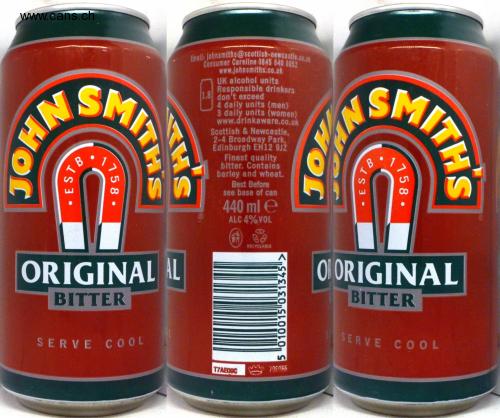 Email: Johnsmiths@scottish-newcastle.co.uk SMIT CMITHE Consumer Careline 0845 840 0052 www.johnsmiths.co.uk UK alcohol units Responsible drinkers 1.8 don't exceed 4 daily units (men) 3 daily units (women) www.drinkaware.co.uk Scottish & Newcastle, 2-4 Broadway Park, Edinburgh EH12 9JZ Finest quality bitter. Contains barley and wheat. Best Before see base of can SMIT 1 440ml e ALC 4% VOL RECYCLABLE O1 ORIGINAL ORIGINAL L BITTER BITTER SERVE COOL SERVE COOL T7ABOOC AHS 158. 158. .EST .EST 5 010015 031345
