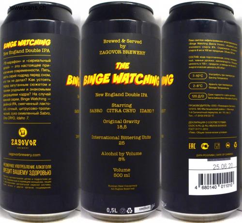 New England Double IPA Koro is contraindicated in children and adolescents up to and diseases of the central nervous system, COMPOSITION: prepared water, brewery malt "Binge Watching (Binge Wachin)", volume fraction Beer light unfiltered unpasteurized BIN BINGE WATCHING WG ethyl alcohol 8%. Ethyl content value in 100g. product: carbohydrates no more than St, alcohol 8 ml in 100 ml of products. Volume 500 ml. In years. pregnant and lactating women, persons Kidney, liver and other digestive organs. Brewed & Served by ZAGOVOR BREWERY BINGE WATCHING TV marathon "and" serial is a real pri- ny, brewer's yeast, hop products, Pishev THE binge " a shred of modernity. Five, there are series in a row before going to bed, Didn't you do that? How to resist energy value 85 kcal. 1 Consume at temperature 7-10 ° C Serving Temperature before a confusing plot and so close and familiar decoration of the frame? In case of important series, Binge Watching double IPA, softened lacto 3rd, juicy, citrus-tropic Store at temperature 2-6 ° C Storage Temperatures New England Double IPA Expiry date from the date of bottling Serve before (from the date of carnng 120 D / D Starring SABRO CITRA CRYO IDANO7 PRODUCER: LLC "Brewery Conspiracy 141013, MO Mytishchi district, Mytishchi, 1st Silikatny lane, ow. 14, p. 2. SABE ED7 cichesky, dry hopped Sabro, Citra CRYO, Idaho 7. Tel .: +7 (910) 01922 17. Original gravity 18.5 DECLARATION OF CONFORMITY: EAES N RU D-RU.HB29.B.00339 / 20 GOST 31711-2012 "Beer. General specifications " Inte International Bittering Units ZAJOVOR 25 EAC PG BREWER Y Alcohol by Volume eight% zagovorbrewery.com RELEASE DATE DATE OF CANNING 1 MEASURED ALCOHOL CONSUMPTION 06/25/20 FEATURES YOUR HEALTH Volume 500 ml Russian Beer Conspiracy All Rights Reserved 41 680140 "o011010 0,5L 1ONOЗA22C