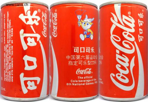 the 6th National Games, PRCPRC. 25 mL EO ALL-ALUMINIUM CAN Ingredients: Carbonated water, sugar, caramel colour, phosphsric acid, natural flavourings (contains caffeine). Canned by China National Cereals, ONs and Foodstufts Import and Export Corporation, Beijing. Under authority of The Coca-Cola Company, owner of the trademarks "Coca-Cola" and TORS " 可口可乐 CocaCola Coca-Cola Cocoola 人云 Coca-Cola 可口可乐。