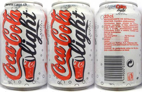 Ingredients: water, carbon dioxide, 0 coloring: caramel E-150d, sweeteners: Coke light BRAND REGISTERED 033 cl. EXTRACTS COOLANT VEGETABLE. Contains sweeteners, E-952, E-950 and E-951, acid regulators E-338 and E-330, natural flavorings. preservative: E-211 and caffeine. Contains a source of phenylalanine. Per 100 ml: Energetic value... o Proteins. Carbohydrates. Lipids.... Manufactured by Refrige, S.A., Cabanas, 2950 PALMELA, with permission from The Coca-Cola Company. Consume preferably before the end of... (batch and date indicated on the base) 1kJ (0.2 kcal) ..0.0 g 0.0 g ......0.0 g 0 0 0. BRAND REGISTRATION MARK REGISTER 5 449000 050205