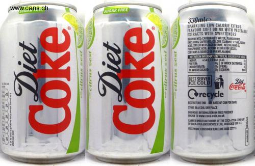 FLAVOUR SOFT DRINK WITH VEGETABLE SPARKLING LOW CALORIE CITRUS SUGAR FREE SUGAR FREE 330mle EXTRACTS WITH SWEETENERS INGREDIENTS: CARBONATED WATER, FLAVOURINGS (INCLUDING CAFFEINE), COLOUR (CARAMEL E150d), CITRIC ACID, SWEETENERS (ASPARTAME, ACESULFAME KL PHOSPHORIC ACID, ACIDITY REGULATOR (E331) CONTAINS A SOURCE OF PHENYLALANINE NUTRITION INFORMATION TYPICAL VALUES PER 100ml 4.5kJ, 1.0kcal | FAT: ENERGY: PROTEIN: CARBOHYDRATE: OF WHICH SUGARS: Og Og OF WHICH SATURATES: Og FIBRE: OgI SODIUM: 0g trace BEST SERVED ICE COLD Diet Coca-Cola Crecycle i 30ml can tans BEST BEFORE END-SEE BASE OF CAN FOR DATE 0% STORE IN A COOL DRY PLACE FOR MORE INFORMATION ON THIS PRODUCT LOG ON TO www.Coca-cola.co.uk CANNED UNDER AUTHORITY OF THE COCA-COLA COMPANY BY COCA-COLA ENTERPRISES LTD, UXBRIDGE UB8 1EZ. 0% FREEPHONE CONSUMER CARELINE 0800 227711 % of an adult's guideline daily amount (based on a 2000 kcal diet) with citrus zest with citrus zest 2W02J12B REXAM