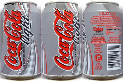 e0.33 liters low calorie, caffeinated gas eriscienes. drink with plant extracts, m stsn Ingredients: water, carbonic acid, color medium phosphoric acid and citric acid, Stai cyclamate, acesulfame-K, aspartame (contains Ph alaninquelle)], Aroma, Aroma Koffe Coke aght Approximate values per 100 mt Calorific value <1.0 J <0.25 kcal protein carbohydrates fat TRADEMARK Coke Line 030/226 069 069 Coca-Cola GmbH, Bers With permission before THE COCA-COLA COMPA www.coke-light.de 2005 The Coca-Cola Coni At least durable until the end: please refer Can bottom DEPOSIT CENT 28 000 TRADEMARKS