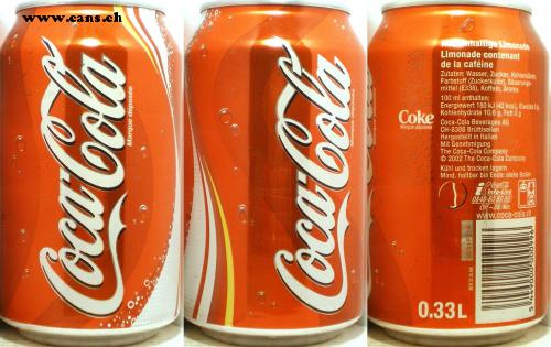 whaltige Limonade Limonade contenant de la caféine Zutaten: Wasser, Zucker, Kohlensäure, Farbstoff (Zuckerkulör), Säuerungs- mittel (E338), Koffein, Aroma 100 ml enthalten: Energiewert 180 kJ (42 kcal), Eiweiss 0g, Kohlenhydrate 10.6 g, Fett 0g Coca-Cola Beverages AG CH-8306 Brüttisellen Hergestellt in Italien Mit Genehmigung The Coca-Cola Company © 2002 The Coca-Cola Company Kühl und trocken lagern Mind. haltbar bis Ende: siehe Boden PCoca-Cola Info-Line 0848-80 80 00 CHF-08/Min. www.coca-cola.ch Coke Marque déposée 0.33L Marque déposée Marque déposée EMarque dép osée REXAM 3S 31F21A 10006