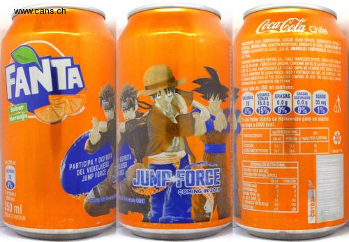 lump 50th Amvexa rersary ©BNEI S MARCA REGISTRADA DE THE COCA-COLÀ COMPANY. O 2018 THE COCA-COLA COMPAR FABRICADO POR ENVASES CENTRAL S.A.-CALLE MIRAFLORES N°8755-RENCA RES. SESMA N NGREDIENTES: AGUA CARBONATADA, AZÚCAR, ACIDO CITRICO, SABORIZANTES NATURAL AETIFICIAL, SUCRALOSA, ALMIDON MODIFICAD0, BENZOATO DE SODIO, ACESULFAMO DE POTASIO, GLUCONATO DE SODIO, S.A.I.B., AMARILLO CREPUSCULO, ROJO ALLURA K 1538 DEL 20-04-95. FABRICACION CHILENA. CONSUMIR ANTES DE LA FECHA INDICADA EN A BASE DE LA LATA. MANTIENGAMOS LA CIUDAD LIMPIA NO BOTANDO ESTE ENVASE EN LA VA PUBLICA MANTENER EN LUGAR FRESCO, SECO Y PROTEGIDO DEL SOL NO CONGELAR FANTA Coca-Cola Chile DSS Y BHA FANTA NFORMACION AL CONSUMIDOR: 800 21 9999. Cada lata de 350 ml contiene: AZUCARES TOTALES 16.8 g GRASAS 0.0 g 0% GRASAS SATURADAS 0.0 g CALORIAS SODIO 70 35 mg Sabor 4% 19% 0% 1% Naranja, % del Valor Dlario de Referencia para un adulto en base a 2000 kcal. mg EN BEBIDA FINAL IDA 0OSIS EDULCORANTE 100 ml PORCION mg/kg PESO CORPORAL YSOMETS ACESULFAMO DE POTASIO: 16.7 12.2 15 15 6.1 33.4 10434 P VY PARTICIPA Y DISFRUTA ELUDEGO DEL VIDEOJUEGOTSFRUTA RCE ita 350 ml: CALORIAS 70 JUMP FORCE C. JUMP FORCE INFORMACION NUTRICIONAL PORCION: 1 VASO (200 ML) PORCOHES POR ENVASE: APROX.2 100 ml 1 PORCION ENERGIA (cal) PROTEIMAS (O) GRASA TOTAL (@) R. DE C. DISP. (9) AZOCARES TOTALES (0) GOOIO (no) 20 40 COMING IN 2019 AmIwersary ©BNEI 4.8 4.8 S10 9.6 9.6 $20 CUump 50th Amvese 350 ml EOA DE FANTASIA C91B24