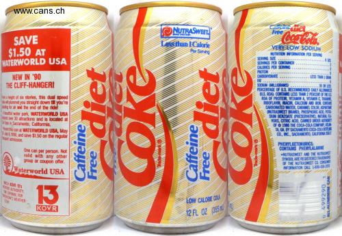 O NUTRASWEET Free Coca-Cola AND SWEETENER SAVE $1.50 AT WATERWORLD USA Less than 1 Calorie Per Serving VERY LOW SODIUM NUTRITION INFORMATION PER SERVING 6 02S SERVING SIZE SERVINGS PER CONTAINER CALORIES PER SERVMNG PROTEIN CARBOHYDRATE FAT SODIUM (MILLIGRAMS) PERCENTAGE OF U.S. RECOMMENDED DAILY ALLOWANCES (U.S. RDA): CONTAINS LESS THAN 2 PERCENT OF THE US RDA OF PROTEM, VITAMIN A, VITAMIN C, THIAMINE, RIBOFLAVIN, NACIN, CALCIUM AND IRON CONTAINS CARBONATED WATER, CARAMEL COLOR, ASPARTAME ONUTRASWEET BRAND), PHOSPHORIC ACIO, POTAS SIUM BENZOATE (PRESERVATIVE), NATURAL FLA LESS THAN 1 GRAM NEW IN '90 THE CLIFF-HANGERI 35 OR LESS Fom a height of sbx stories, this dual speed side wil plummet you straight down till you're ading for air and the end of the ride! A beadtiful water park, WATERWORLD USA atres over 30 attractions and is located at Epo in Sacramento, Califormia. Pesent this can at WATERWORLD USA, May 5-ady 9,1990, and save $1.50 on the regular Passort admission. VORS, CITRIC ACID, CANNED UNDER AUTHORTY OF 1986 THE COCA-COLA COMPANY, ATLAN TA, GA. BY SACRAMENTO COCA-COLA BOTTUNG CO., INC., SACRAMENTO, CALIFORNIA 95817 One can per person. Not valid with any other group or coupon offer. PHENYLKETONURICS: CONTAINS PHENYLALANINE NUTRASWEET AND THE NUTRASMEET SYMBOL ARE REGISTERED TRADEMARKS OF THE NUTRASWEET CO. CONSUMER INFORMATION CALL 1-800-438-2653 Waterworld USA DC-2 P WATCH KOVR 13's MEATHER AUTHORITY, TOM LOFFMAN, FOR MCRROW'S WEATHER TODAY 13 Low CALORIE COLL KOVR 12 FL 0Z (355 m Caffeine Free Caffeine Free 3. ALL ALUMINUM CAN