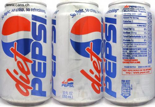 light, so crisp, so refreshing my Ⓒ Gi light, so crisp,sheshing So light, diet PEPSI. 12 FL OZ (355 mL) PEPSI-COLA. SUGAR-FREE LOW SODIUM Facts Nutrition Serving Size Can Serving Amount Per Calories 0 Total Fat Og Sodium 35mg 1% Total Carbohydrate 0g 0% Protein Og 0% % Daily Value* 0% Percent Daily Values are based on a 2,000 calorie diet. FOR BEST TASTE = Drink by Date on Bottom of Can CONTAINS: CARBONATED WATER, CARAMEL COLOR, ASPARTAME**, PHOSPHORIC ACID, POTASSIUM BENZOATE (PRESERVES FRESHNESS), CAFFEINE, CITRIC ACID AND NATURAL FLAVORS. **PHENYLETONURICS: CONTAINS PHENYLALANDE PLEASE RECYCLE STORE IN A COOL PLACE VISIT PEPSI WORLD ON THE INTERNET http://www.pepsl.com 2N-101 BOTTLERS FOR THE PEPSI BOTTLING GROUP INC., SOMERS, NY 10589 UNDER THE AUTHORITY OF PEPSICO, INC. FOR COMMENTS OR QUESTIONS, CALL/PARA COMENTARIOS O PREGUNTAS, LLAME 1-800-433-25 LOCAL MANUFACTURED BY 0 02 08 05 M43