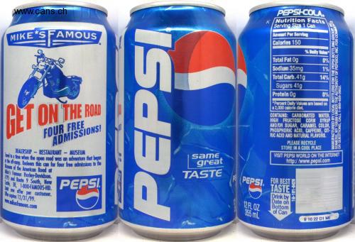 MIKE'S FAMOUS ET ON THE ROAD GET ON FOUR FREE ADMISSIONS! DEALERSHIP-RESTAURANT - MUSEUM Travel to a time when the open road was an adventure that began the off-ramp. Redeem this can for four free admissions to the Museum of the American Road at Mike's Famous Harley-Davidson. 295 and Route 9 South, New Castle, DE, 1-800-FAMOUS-HD. Unit one offer per customer. Offer expires 12/31/99. www.mikesfamous.com ES PEPSI IS! same great TASTE P PEPSICOLA 12 FL OZ 355 mL K/Nutrition Facts Serving Size 1 Can Amount Per Serving Calories 150 Total Fat Og Sodium 35mg Total Carb.41g Sugars 41g Protein Og *Percent Daily Values are based on a 2,000 calorie diet. PEPSI FOR BEST TASTE % Dally Valne 0% 1% 14% 0% Drink by Date on Bottom of Can CONTAINS: CARBONATED WATER, HIGH FRUCTOSE CORN SYRUP AND/OR SUGAR, CARAMEL COLOR, PHOSPHORIC ACID, CAFFEINE, CIT- RIC ACID AND NATURAL FLAVORS. PLEASE RECYCLE STORE IN A COOL PLACE 10-101-0428 MANUFACTURED BY LOCAL BOTTLERS FOR THE PEPSI BOTTLING GROUP, INS SOMERS, NY 10589 UNDER THE AUTHORITY OF PEPSICO, INC. FOR COMMENTS OR QUESTIONS, CALL 1-800-433-2652. VISIT PEPSI WORLD ON THE INTERNET http://www.pepsl.com 9 10 22 D1 ME VE