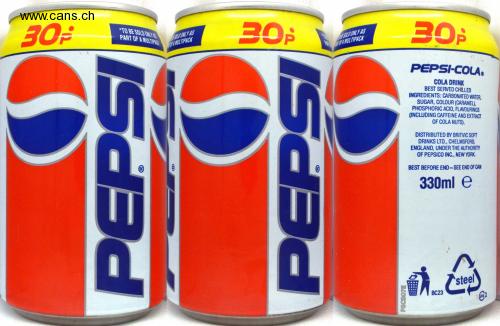 30% TO BE SOLD ONLY AS PART OF A MULTIPACK T OCE RESOLD ONLY AS TOFA MULTIPACK BOP S Bo THE SOLD ONLY AS RT OF A MULTIPACK PSCBOTE 30P PEPSI-COLA. COLA DRINK BEST SERVED CHILLED INGREDIENTS: CARBONATED WATER, SUGAR, COLOUR (CARAMEL), PHOSPHORIC ACID, FLAVOURINGS (INCLUDING CAFFEINE AND EXTRACT OF COLA NUTS). DISTRIBUTED BY BRITVIC SOFT DRINKS LTD., CHELMSFORD, ENGLAND, UNDER THE AUTHORITY OF PEPSICO INC., NEW YORK. BEST BEFORE END-SEE END OF CAN 330ml e BC23 steel M₂