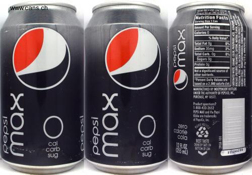 Isded 5 max O cal carb sug !SODO X pepsi ma O cal carb sug Isded max zero calorie cola 12 FL OZ (355 mL) SUGAR FREE VERY LOW SODIUM 35mg or less per 240 mL (8 fl oz). Nutrition Facts Serving Size 1 Can Amount Per Serving Calories 0 % Daily Total Fat Og Sodium 35mg Total Carb. Og Sugars Og Protein Og Value* CARBONATED WATER, CARAMEL COLOR, PHOSPHORIC ACID, ASPARTAME POTASSIUM BENZOATE (PRESERVES FRESHNESS), CAFFEINE, NATURAL FLAVOR. ACESULFAME POTASSIUM, CITRIC ACID, CALGUM DISODIUM EDTA (TO PROTECT FAVORI, PANAX GINSENG EXTRACT PHENYLKETONURICS: CONTAINS PHENYLALANINE CAFFEINE CONTENT: 69 mg/12 fl oz. WWW.PEPSI.COM Not a significant source of other nutrients. BEST TASTE DRINK BY DATE ON BOTTOM OF CAN 0% 2% 0% *Percent Daily Values are based on a 2,000 calorie diet. MANUFACTURED BY INDEPENDENT BOTTLERS UNDER THE AUTHORITY OF PEPSICO, INC, PURCHASE, NY 10577. Product questions? 1-800-433-2652 PEPSI MAX and the Pepsi Globe are trademarks of PepsiCo, Inc. PLEASE RECYCLE 295A-101 911 24A2 BG 24