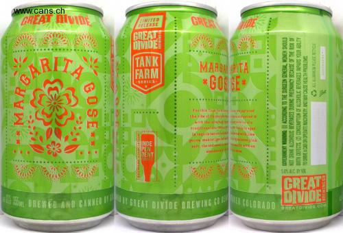 GREAT DIVIDE GARITA MARGA GOSE Ser LIMITED RELEASE GREAT DIVIDER TANK FARM -SERIES- BREWERS ASSOCIATION CERTIFIED INDE PEN DENT CRAFT GREAT MARGARITA GOSSE* * E For this Tank Farm releasease, we captured the vibe of the poolside cabana and paired it with the refreshing characteristics of a traditional sour German Partially aged in tequila barrels and enhanced with lime puree, makrut lime leal and and Himalayan pink salt, the end result is tatuant and dry with an abundance of dra trus notes ..... 2 355 ML BREWED AND CANNED BYD BY GREAT DIVIDE BREWING CODER COLORADO (1) ACCORDING TO THE SURGEON GENERAL, WOMEN SHOULD NOT DRINK ALCOHOLIC BEVERAGES DURING PREGNANCY BECAUSE OF THE RISK OF BIRTH DEFECTS. (2) CONSUMPTION OF ALCOHOLIC BEVERAGES IMPAIRS YOUR ABILITY TO DRIVE A CAR OR OPERATE MACHINERY, AND MAY CAUSE HEALTH PROBLEMS. GOVERNMENT WARNING: 5.8% ALC. BY VOL ALL ALUMINUM PLEASE RECYCLE 00526A2BA* Ball GREAT DIVIDE GREATDIVIDE.COM
