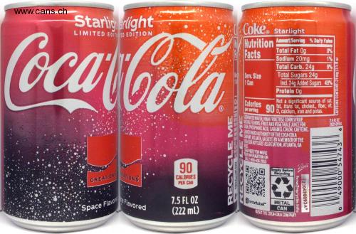 Starligarlight LIMITED EDITIOTED EDITION Coca-Cola CREATIONS Space Flavored REATIONS e Flavored 90 CALORIES PER CAN 7.5 FL OZ (222 mL) RECYCLE ME ܣ ܢܐܒܒܙ ܕpaa Coke Starlight DW 3IDADES Nutrition Facts 10 1 Can Serv. Size Calories per serving SCAN HERE FOR MORE FOOD INFORMATION OR Amount/Serving % Daily Value Total Fat Og 0% Sodium 20mg 1% Total Carb. 24g 9% Total Sugars 24g Incl. 24g Added Sugars 49% Protein Og 90 D, calclum, iron and potas. CURSONATED WATER, HIGH FRUCTOSE CORN SYRUP MATURAL FLAVORS, FRUIT AND VEGETABLE JUICE FOR COLOR, PHOSPHORIC ACID, CARAMEL COLOR, CAFFEINE CANNED UNDER AUTHORITY OF THE COCA-COLA COMPANY, ATLANTA, GA 30313 BY A MEMBER OF THE COCA-COLA BOTTLERS' ASSOCIATION, ATLANTA, GA 31327 CALL 1-800-438-2653 Not a significant source of sat fat, trans fat, cholest., fiber, vit smartlabel Empty Before Recycling Baix how2recycle.Info 200420093 A* METAL CAN 62021 THE COCA-COLA COMPANY CAFFEINE CONTENT: 21 mg/7.5 fl oz 7.5 FL OZ 2021-01184 49000 54743