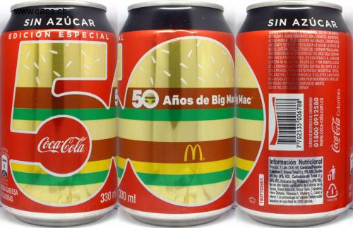 SIN AZÚCAR EDICIÓN ESPECIAL 0 0% BUDA GASEOSA CALORIAS Coca-Cola AL √√50 Años 330 330 ml Años de Big Mac Mac M. 1807122401 SIN AZÚCAR INGREDIENTES AGOR CANDONATADA, COLOR CARAMELO ACIDULANTE (ACIDO FOSFORICO), EDULCORANTES (ASPARTAME ACESULFAME K) SABORIZANTES NATURALES, CONSERVANTE (BENZOATO DE SODIO), REGULADOR DE ACIDEZ (CITRATO DE SODIO), CAFEINA. FENILCETONURICOS: CONTIENE FENILALANINA FABRICADO BAJO AUTORIZACION DE THE COCA-COLA COMPANY POR INDUSTRIA NACIONAL DE GASEOSAS S.A., AVENIDA CARRERA 96 No. 24 C-94, BOGOTA D.C. Y POR EMBOTELLADORA DE LA SABANA S.A.S. CARRETERA CENTRAL DEL NORTE, KM 22. ZONA FRANCA PERMANENTE PARQUE INDUSTRIAL FEMSA. TOCANCIPA, CUNDINAMARCA. REGISTRO SANITARIO RSA-003403-2017, CONSUMIR PREFERENTEMENTE ANTES DE: VER FONDO. REFRIGERESE DESPUES DE ABIERTO. ©2018 THE COCA-COLA COMPANY 7 702535 006788 CENTRO DE RESPUESTA AL CONSUMIDOR 01800 0912580 www.coca-cola.com.co Información Nutricional Porción: 1 Lata (330 ml). Cantidad/Porción: Calorías 0, Grasa Total 0 g (0% VD), Sodio 85 mg (4% VD), Carbohidrato Total 0 g (0% VD), Azúcares 0 g Proteina 0 g (0% VD). No es una fuente significativa de Calorias de la Grasa, Grasa Saturada, Grasa Trans, Colesterol, Fibra Dietaria, Vitamina A, Vitamina C, Calcio y Hierro. "Los porcentajes de Valores Diarios están basados en una dieta de 2000 calorias. Coca-Cola Colombia ES. recicle BE SHUL