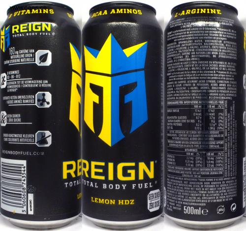 VITAMINS REIGN TOTAL BODY FUEL Ⓡ 160 mg mg CAFEINE VAN NATUURLIJKE BRON / CAFEINE D'ORIGINE NATURELLE B VITAMINES 83-86-812 BUDRAGEN TOT DE VERMINDERING VAN VERMOEIDHEID/ CONTRIBUENT À RÉDUIRE LA FATIGUE VERTAKTE KETEN AMINOZUREN /ACIDES AMINES RAMIFIÉS GEEN SUIKER /ZERO SUCRE ZONDER KUNSTMATIGE KLEUREN SANS COLORANTS ARTIFICIELS REIGNBODYFUEL.COM 809090, S M1BK28C BCAA AMINOS LE ID REREIGN TOTAL TOTAL BODY FUEL LEMON HDZ 980 GEEN SUIKER ZERO SUCHE L-VALINE)], CAFEINE EN L-ARGININE L-ARGININE REGNO LEMON HDZ-KOOLZUURHOUDENDE DRANK MET CITROENSMAAK EN TOEGEVOEGDE VITAMINES B3, B6 EN B12 MET ZOETSTOFFEN. BEVAT BCAA (VERTAKTE KETEN AMINOZUBEN ALLENGINE L-ISOLEUCINE, REIGN is geformuleerd met cafeïne en B-vitamines. *Vitamines B3, B6 en 812 kunnen bijdragen tot de vermindering van vermoeidheid en moeheid en tot een normaal energieleverend metabolisme. Vitamine B6 kan bijdrage tot een normaal metabolisme van eiwitten en glycogeen. INGREDIENTEN: SPRANKELEND WATER, VOEDINGSZUUR (CITROENZUUR) ZUURTEREGELAARS (NATRIUMCITRATEN, KALIUMCITRATEN), BCAA (0,2%) (L-LEUCINE, L-ISOLEUCINE, L-VALINE), AROMA'S, ZOETSTOFFEN (SUCRALOSE ACESULFAAM-K). MALTODEXTRINE, CONSERVEERMIDDELEN (KALIUMSORBAAT NATRIUMBENZOAAT), CAFEINE VAN NATUURLIJKE BRON (0,03%), L-ARGININE (0,01%), VITAMINES [B3 (NICOTINAMIDE), B6 (PYRIDOXINEHYDRO- BOISSON GAZEUSE AU GOUT CITRON ENRICHIE EN VITAMINES B3, B6 ET B12 AVEC EDULCORANTS. CONTIENT DE LA BCAA [ACIDES AMINES RAMIFIES (L-LEUCINE. L-ISOLEUCINE, L-VALINE)], DE LA CAFEINE ET DU L-ARGININE. REIGN est formulé avec de la caféine et des vitamines B. *Vitamines B3, B6 et B12 contribuent à réduire la fatigue et à un métabolisme énergétique normal. La vitamine B6 contribue au métabolisme normal des protéines et du glycogène. INGREDIENTS: EAU GAZEIFIEE. ACIDIFIANT (ACIDE CITRIQUE), CORRECTEURS D'ACIDITE CITRATES DE SODIUM. CITRATES DE POTASSIUM), ACIDES AMINES BCAA (0,2%) (L-LEUCINE, L-ISOLEUCINE. L-VALINE), AROMES, ÉDULCORANTS (SUCRALOSE ACÉSULFAME-K), MALTODEXTRINE. CONSERVATEURS (SORBATE DE POTASSIUM, BENZOATE DE SODIUM), CAFEINE D'ORIGINE NATURELLE (0,03%), L-ARGININE (0,01%), VITAMINES (83 NICOTINAMIDE). B6 (CHLORHYDRATE DE PYRIDOXINE), B12 (CYANOCOBALAMINE)]. VOEDINGSWAARDE PER/ INFORMATIONS NUTRITIONNELLES POUR 500 ml (%¹) 67 kJ/ (16 kcal) (1%) 3,7 g (1%) 100 ml ENERGIE ENERGIE 13 kJ/ (3 kcal) 0,7 g KOOLHYDRATEN/GLUCIDES WAARVAN SUIKERS/DONT SUCRES 0 g EIWITTEN PROTEINES 0,2 g 3 ZOUT/SEL 0,12 g 3 0g (0%) 1,1 g ³ (2%) 0,59 g (10%) VETTEN. VERZADIGDE VETZUREN-VERWAARLOOSBARE HOEVEELHEDEN/CONTIENT DES QUANTITÉS NÉGLIGEABLES DE MATIERES GRASSES, ACIDES GRAS SATURÉS. TREFERENTIE-INNAME VAN EEN GEMIDDELDE VOLWASSENE/ DE REFERENCE POUR UN ADULTE-TYPE (8400 kJ/ 2000 kcal). VITAMINES APPORT EUROPE LIMITED, (alu) REIGN BEVERAGE COMPANY LLC. ENERGY BEVERAGES SOUTH BANK HOUSE. BARROW STREET, DUBLIN 4, IERLAND/ IRLANDE. KOEL EN DROOG BEWAREN/ CONSERVER DANS UN LIEU FRAIS ET SEC. TEN MINSTE HOUDBAAR TOT EINDE - ZIE ONDERZIJDE VAN BLIK/ A CONSOMMER DE PREFERENCE AVANT FIN-VOIR DATE AU FOND DE LA CANETTE. 2019 100 ml (%) 500 ml (%²) 3.2 mg (20%) VITAMINE B3 16 mg (100%) VITAMINE B6 1,4 mg (100%) 0.28 mg (20%) VITAMINE B12 0,50 µg (20%) 2,5 µg (100%) 2DAGELIJKSE REFERENTIE-INNAME/ APPORT QUOTIDIEN DE REFERENCE AANBEVOLEN DAGELIJKSE PORTIE: 500 ml/ PORTION JOURNALIERE CONSEILLÉE: 500 ml 3IN DE VORM VAN VRIJE AMINOZUREN/ 3SOUS FORME D'ACIDES AMINÉS LIBRES. ZWANGER ZIJN OF BORSTVOEDING GEVEN, OF PERSONEN DIE GEVOELIG ZIJN VOOR HOOG CAFEINEGEHALTE. NIET AANBEVOLEN VOOR KINDEREN EN VROUWEN DIE CAFEINE (32 mg/100 ml). DRINK MET MATE IN HET KADER VAN EEN EVENWICHTIGE AUX ENFANTS ET AUX FEMMES ENCEINTES OU ALLAITANTES OU AUX PERSONNES VOEDING EN EEN GEZONDE LEVENSSTIJL./ TENEUR ÉLEVÉE EN CAFÉINE. DÉCONSEILLE SENSIBLES A LA CAFEINE (32 mg/100 ml). CONSOMMER DE FAÇON RESPONSABLE DANS LE CADRE D'UNE ALIMENTATION EQUILIBREE ET D'UN MODE DE VIE SAIN. DIT PRODUCT IS GEEN MAALTIJDVERVANGER/ CE PRODUIT N'EST C PAS UN SUBSTITUT DE REPAS. 500mle