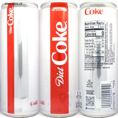 Diet Coke. Coke Coke NO SUGAR NO CALORIES e Diet 日 13 153 12 FLO FLOZ (35545 m) Coke Nutrition Facts Serv. Size 1 Can Amount Per Serving Calories Total Fat Og Sodium 40mg Total Carb. Og Total Sugars Og Incl. Og Added Sugars 0% Protein Og 0 Not a significant source of sat. fat, trans fat, cholest., fiber, vit. D, calcium, iron and potas. 0. please recycle % Daily Value 0% 2% 0% SCAN HERE FOR MORE FOOD INFORMATION smartlobel PHENYLKETONURICS: CONTAINS PHENYLALANINE ©2018 THE COCA-COLA COMPANY CONSUMER INFORMATION CALL 1-800-438-2653 www.dietcoke.com PHOSPHORIC ASPARTAME, COLOR, ACID, POTASSIUM BENZOATE (TO PROTECT TASTE), NATURAL FLAVORS, CITRIC ACID, CAFFEINE. CARAMEL CARBONATED WATER, CANNED UNDER AUTHORITY OF THE COCA-COLA COMPANY, ATLANTA, GA 30313 BY A MEMBER OF THE COCA-COLA BOTTLERS' ASSOCIATION, ATLANTA, GA 30327. CAFFEINE CONTENT: 46 mg/12 fl oz 0 LS67000067 0 2017-00780 12 FL OZ 2132 80452 A*