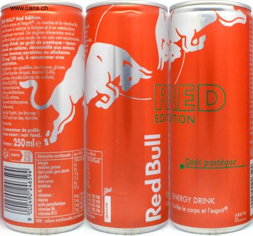 RED BULL Red Edition. Vivite le corps et l'esprit®. La niacine et la vitamine B6 contribuent à réduire la fatigue et à un métabolisme énergétique normal. Un régime alimentaire varié et équilibré ainsi qu'un mode de vie sain sont recommandés Drink au goût de pastèque - teneur élevée en caféine, déconseillé aux enfants et aux femmes enceintes ou allaitantes (32 mg/100 ml). À consommer avec Energy modération. hgredients: eau gazéifiée, saccharose, glucose, codifiant (acide citrique), taurine (0,4%), correcteur d'acidité (citrates de sodium), caféine (0,03%), omines (niacine, de pantothénique, B6, B12), arômes, colorants (anthocyanes, riboflavines). Red Bull GmbH, Am Brunnen 1, 5330 Fuschl am See, Autriche Pasteurisé. A consommer de préfé- rence avant : voir fond. Contenu: 250mle CANETTE C 769972 067200 6 Déclaration nutritionnelle pour 100 190 kJ (45 énergie matières grasses dont acides gras saturés glucides dont sucres protéines sel vitamines: niacine acide pantothénique vitamine B6 vitamine B12 Og 09 11g 11g 0g 8222 8 mg 33% 2 mg 2 mg 2 µg/80% VNR: valeurs nutritionnelles de référence B6 el mondes S 190kJ (45 kcal) Ball mg/ 50% VNR mg/33% VNR mg/143% VNR 99/80% VNR de reference 19W24L03B RED EDITITION Red Bull Coût pastèque E ENERGY DRINK Vivifie le corps corps et l'esprit AB6FR 04 MOON Ac Co
