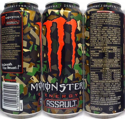 KARNITYNA MONSTER® ENERGY ASSPULTⓇ MONSTERZE NIE PRZEJMUJEMY SEZBYTNIO POLITYKA. NEWAZNE, CZY JESTEŚ PO PRAWEJ. CZY PO LEWEJ STRONIE. ODGRZEBALIŚMY KAMUFLAŻ, BO UWAZAMY, ZE TO IDEALNY MOTYW, BY ZAATAKOWAĆ CODZIENNOŚĆ ZAKTUALIZOWANY MONSTER ASSAULT TO REWOLUCJA SMAKU. JAKIEJ JESZCZE NIE BYŁO. ZOPTYMALIZOWANY I UMOCNIONY NASZA SPRAWDZONA W BOJU MIESZANKA MONSTER ENERGY, ASSAULT UTRZYMA CIĘ W GOTOWOŚCI DO DZIAŁANIA #. 321390 1021 Unleash the Beast! monsterenergy.com 5 060896 622309" 20822821C TAUN URYNA A ŻEŃSZE MOONSTER EENERGY ASSAULT WITAMINY Z GRUPY B MONSTER ASSRULTO MERGY GAZOWANY NAPOJ ENERGETYCZNY Z TAURYNA, ŻEŃ- SZENIEM, L-KARNITYNĄ, KOFEINA Z DODATKIEM WITAMIN 2 GRUPY B. ZAWIERA CUKRY I SUBSTANCJĘ SŁODZĄCĄ. #Kofeina może przyczynić się do poprawy koncentracji izwiększonej czujności. Witaminy B3 (niacyna), B6, 82 i B12 przyczynia się do zmniejszenia uczucia zmęczenia i znużenia. SKŁADNIKI: WODA, CUKIER, SYROP GLUKOZOWY, DWUTLENEK WEGLA, TAURYNA (0,4%), BARWNIK: E 1500: KWAS: KWAS FOSFOROWY; REGULATOR KWASOWOŚCI: CYTRYNIANY SODU; WYCIĄG Z KORZENIA ZEN-SZENIA (0,08%), AROMATY, L-WINIAN L-KARNITYNY (0,04%), SUBSTANCJE KONSERWUJĄCE: KWAS SORBOWY, KWAS BENZOESOWY; KOFEINA (0,03%), WITAMINY: NIACYNA. WITAMINA B6, RYBOFLAWINA, WITAMINA B12: SUBSTANCJA SŁODZĄCA: SUKRALOZA, CHLOREK SODU, INOZYTOL, MALTODEKSTRYNA. INFORMACJA O WARTOŚCI ODŻYWCZEJ W 100 ml W 500 ml (%) 180 kJ (42 kcal) 900 kJ (212 kcal) (11%) 11 g 53 g (20%) 10 g 52 g (58%) 0,05 g 0,26 g (4%) ENERGIA WEGLOWODANY W TYM CUKRY SOL ZAWIERA ZNIKOME ILOŚCI TŁUSZCZU, KWASÓW TŁUSZCZOWYCH NASYCONYCH, BIAŁKA *REFERENCYJNA WARTOŚĆ SPOŻYCIA DLA PRZECIĘTNEJ OSOBY DOROSŁEJ (8 400 kJ/2 000 kcal) WITAMINY W 100 ml (%** W 500 ml (%** 8,5 mg (53%) 43 mg (266%) 0,80 mg (57%) 4,0 mg (286%) 0,70 mg (50%) 3,5 mg (250%) 2,5 µg (100%) 13 µg (500%) **DZIENNE REFERENCYJNE WARTOŚCI SPOŻYCIA WYSOKA ZAWARTOŚĆ KOFEINY; NIE ZALECA SIĘ STOSOWANIA U DZIECI, KOBIET W CIĄŻY I KOBIET KARMIĄCYCH PIERSIĄ ORAZ OSÓB WRAŻLIWYCH NA KOFEINE (32mg/100ml). KONSUMUJ ODPOWIEDZIALNIE. ZRÓWNOWAŻONA DIETA I ZDROWY STYL ŻYCIA MAJA L ZNACZENIE DLA ZACHOWANIA ZDROWIA. ©2021 MONSTER ENERGY COMPANY. MONSTER ENERGY LIMITED, SOUTH BANK HOUSE, BARROW STREET, DUBLIN 4, IRLANDIA. WYPRODUKOWANE W SERBI. PRZECHOWYWAĆ W SUCHYM I CHŁODNYM MIEJSCU. NAJLEPIEJ SPOŻYĆ PRZED KOŃCEM: PATRZ NA SPODZIE PUSZKI. 500mle NIACYNA WITAMINA B6 RYBOFLAWINA WITAMINA B12 (alu)