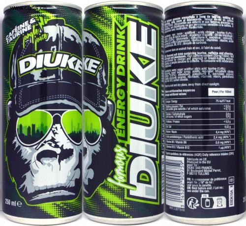 THÊN AURINE gle Ijuice DIUKNE 250 ml e Guy ENERGY DRINK Boisson gazeuse aromatisée à base de taurine, caféine et 20mg/100ml). Déconseillée aux enfants et aux femmes enceintes ou amines, avec sucre et édulcorants. Teneur élevée en caféine tantes, aux diabétiques ou aux personnes sensibles à la caféine. A consommer avec modération. Pasteurisée. 1139 ingredients: eau; sucre; acidifiant: acide citrique; taurine (0,4%); me sirop de sucre inverti; régulateur d'acidité: citrate trisodiqué: Caramel au sulfite d'ammonium, riboflavine; vitamines: niacine, acide cine (0,02%); edulcorants: acésulfame K, sucralose; colorants pantothenique, B6, B12; dioxyde de carbone. Acconserver dans un endroit frais et sec, à l'abri du soleil. E Flavoured soft drink containing taurine, caffeine and vitamins, W sugar and sweeteners. High caffeine content (20mg/100ml). Not recommended for children and pregnant or breast-feeding women, betics or people sensitive to caffeine. To consume with moderation. ENC Pas Pasteurized. ngredients: water; sugar; acidifier: çitric acid; taurine (0.4%); ouring invert sugar syrup; acidity regulator: trisodium citrate, teine (0.02%); sweeteners: acesulfame K, sucralose; colours: ammonia caramel, riboflavin; vitamins: niacin, pantothenic a B6, B12; carbon dioxide. 20. St Store in a cool and dry place, away from direct sunlight. Vale aleurs nutritionnelles moyennes Average nutritional values: E Energie/Energy Matières grasses/Fat dont acides gras saturés/ of which saturates |||||||||||||||||||||||||||| Glucides/Carbohydrate dont sucres/ of which sugars Pr Proteines/Protein Se Sel/ Salt Niacine/Niacin Acide pantothénique/Pantothenic acid Vitamine B6/Vitamin B6 Vitamine B12/Vitamin B12 3 145222 909759 Pour/For 100ml 75 kJ/17 kcal <0,5 g <0,1 g MNR 2-26719-NI 3,9 g 3,99 Apports quotidiens de références (AQR) Daily reference intakes (DRI) Fabriquée en UE Produced in the EU pour/for: DIUKE SAS FRANCE, 91 Boulevard Michel Perret, F-38210 TULLINS <0,5 g 0,02 g 6,4 mg (40%*) 2,4 mg (40%*) 0,6 mg (40%*) 1 µg (40%*) OFR: A consommer de préférence avant fin:/N° de lot: voir sous la canette. EN EN: Best before end: / Lot no.: see under the can. FR E5DK10A N 250