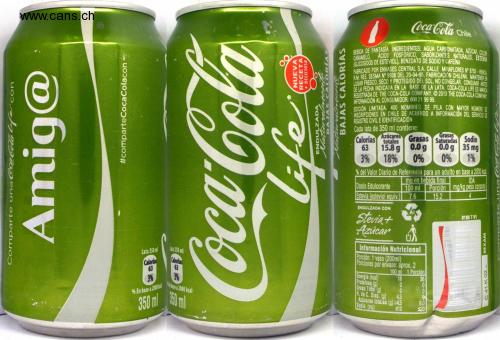 Comparte una Coca-Cola life con nig An #comparteCocaColacon Lata 350 ml Calorias 63 3% Lata 350 ml Calorias 63 3% En base a 2000 kcal % En base a 2000 kcal 350 ml 350ml 00 NUEVA RECETA + DELICIOSA ENDULZADA BAJAS CALORÍAS BAJAS CALORÍAS Naturalmen Naturalmente Coca-Cola Chile BEBIDA DE FANTASÍA. INGREDIENTES: AGUA CARBONATADA, AZÚCAR, COLOR CARAMELO, ÁCIDO FOSFORICO, SABORIZANTES NATURALES, ESTEVIA (GLICOSIDOS DE ESTEVIOL), BENZOATO DE SODIO Y CAFEÍNA FABRICADO POR ENVASES CENTRAL S.A. CALLE MIRAFLORES N° 8755-RENCA R.M. RES. SESMA N° 9938 DEL 20-04-95. FABRICACIÓN CHILENA. MANTENER EN LUGAR FRESCO, SECO Y PROTEGIDO DEL SOL. NO CONGELAR. CONSUMIR ANTES DE LA FECHA INDICADA EN LA BASE DE LA LATA. COCA-COLA LIFE ES MARCA REGISTRADA DE THE COCA-COLA COMPANY. 2013 THE COCA-COLA COMPANY INFORMACIÓN AL CONSUMIDOR: 800 21 99 99. EDICIÓN LIMITADA. 400 NOMBRES DE PILA CON MAYOR NÚMERO DE INSCRIPCIONES EN CHILE DE ACUERDO A INFORMACIÓN DEL SERVICIO DE REGISTRO CIVIL E IDENTIFICACIÓN Cada lata de 350 ml contiene: Grasas Grasas Saturadas Sodio 60066 15.8 g 0.0 g 0.0 g 35 mg 18% 0% Azúcares Calorías totales 63 3% 0% 1% % del Valor Diario de Referencia para un adulto en base a 2000 kcal mg en bebida final IDA 100 ml Porción mg/kg peso corporal 7.6 15.2 Dosis Edulcorante Estevia (esteviol equiv.) ENDULZADA CON Steviat Azúcar Información Nutricional Porción: 1 vaso (200ml) Porciones por envase: áprox. 2 100 ml 1 Porción 36 Energia (kcal) Proteinas (0) Grasa Total (g) H. de C. Disp. (g) Azúcares totales (g) 4.5 Sodio (mg) 1800 45 45 410 కుండ 0 Th 9.0 $20 8188 TV1 REXAM C 41 K 02.. 112Apn 6