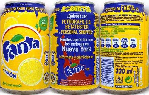 MARTELO EN SERIO PUEDE SER DIVER T fanta LIMON 6% ZUMO DE LIMON Ch CON ZUMO DE LIMON Esta lata d conte Energia 175 kcal 915 e la c ajaz CON UMO MON VERTIDO Esta lab Energia 175 kcal $1.5 anta zero ROBERTU ¿Quieres ser FOTÓGRAFO 2.0, BETATESTER O PERSONAL SHOPPER? Puedes aprender con los mejores en Nueva York Infórmate y participa en ि Fantares Promoción válida del 05/05/11 al 31/08/11. Para mayores de 15 años residentes en España Más info en el 902 501 350 y en www.fanta.es BEBIDA Ingred concentra conservale E-140 EL ALIN ENERGÉTICO: 222 kJ, 53 kcal GRASAS PROTEINAS PROTEN ATOS DE CARBONO E LOS CUALES AZUCARES: 12.8 SODIO: Esta leta de 330 ml contiene Esta PARTICIPA EN FANTA ES BEBIDA REFRESCANTE DE ZUMO DE FRUTAS. bgredientes: agua carbonatada, azúcares, 6% de zumo de limón a partir de conservador E-202, estabilizadores E-414 y E-445, aromas y colorantes concentrado, acidulante ácido cítrico, antioxidante ácido ascórbico, F-140 y E-1616. INFORMACIÓN NUTRICIONAL POR 100 ml Energa 175 O DE LAS CUALES ÁCIDOS GRASOS SATURADOS: 12.8 FIBRA ALIMENTARIA Energia Azúcares 175 kcal 42 g 9% 47% la Cantidad Diaria Orientativa para un adulto. Basado en un aporte diario de 2.000 kcal. Es reis recomendable seguir una dieta variada, moderada y equilibrada, así como estilo de vida activo y saludable. Envasado con autorización del propietario de la marca por: ver tapa. Grasas Og Grasas Saturadas Og 700900,000677 S 0% 0% Sodio Og 0% A CONTENEDOR AMARILLO REXAM Consumir preferentemente antes del - Lote: ver la base. Proteger de la luz solar. Preservar de olores agresivos. Conservar en lugar limpio, fresco y seco. ©2007 THE COCA-COLA COMPANY. 330 ml www.fanta.es un producto de 7L12D28C hunchweg 229.009 XL