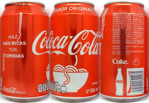 860008 HAZ MÁS RICAS TUS COMIDAS Coca-Cola México Coloca-Cola SABOR ORIGINAL Grasa saturada 0 kcal 0% Este envase epi Otras Aigars 08 grasas totales kcal 149 kal 0% 41% % de los nutriment Este envase aportas Oras Azúcares Sodio grasas totales 149 kcal 36 mg 2% de los nutrimentos diarios. Energía 149 kcal REFRESCO cont. net. 355 ml INGREDIENTES AGUA CARBONATADA, AZUCARES Y CONCENTRADOS COCA-COLA. HECHO POR INDUSTRIA ENVASADORA DE QUERETARO, S.A. DE C.V., AV. 5 DE FEBRERO No. 1323, C.P. 76130, QUERETARO, QRO., CON AUTORIZACIÓN DE THE COCA-COLA COMPANY, PROPIETARIA DE LA MARCA REGISTRADA "COCA-COLA". REFRESCO HECHO EN MÉXICO. D.R. THE COCA-COLA COMPANY 2017. INFORMACIÓN NUTRIMENTAL: TAMANO DE LA PORCIÓN: 200 ml. PORCIONES POR ENVASE: 1,77. CANTIDADES POR PORCIÓN: CONTENIDO ENERGETICO 357 kJ (84 kcal) PROTEÍNAS O CARBOHIDRATOS DISPONIBLES 21 g. AZÚCARES 210. FIBRA DIETETICA 0 g GRASAS Og GRASAS O SATURADAS 0 g SODIO 20 mg H/LA LLAMA SIN COSTO 01800-704-4400 INFORMACIÓN AL CONSUMIDOR. CONSERVE EL AMBIENTE. DEPOSITE EL ENVASE VACÍO EN LA BASURA. LOTE Y FECHA DE CONSUMO PREFERENTE INDICADO EN EL FONDO DE LA LATA Coke. Coca-Cola Coca-Cola RECICLABLE 7 501055 300075 BDC098
