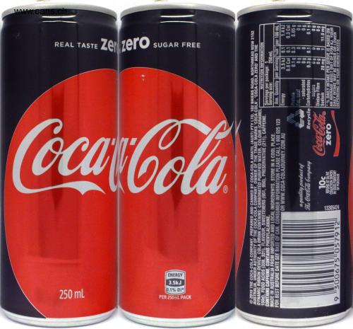 250 mL PER 250mL PACK 0.1% DI* 3.5kJ ENERGY 9 300675 057912 a quality product of The Coca-Cola Company 2016 THE COCA-COLA COMPANY, PREPARED AND CANNED BY COCA-COLA AMATIL (AUST) PTY LTD, 102 BRIENS ROAD, NORTHMEAD NSW 2152 AUSTRALIA, UNDER AUTHORITY OF THE COCA-COLA COMPANY, OWNER OF THE TRADE MARKS 'COCA-COLA', 'COCA-COLA ZERO' AND THE DYNAMIC RIBBON DEVICE. COLA DRINK CONTAINS: CARBONATED PURIFIED WATER, COLOUR (CARAMEL NUTRITION INFORMATION 150d), FOOD ACIDS (338, 331), FLAVOUR, SWEETENERS (951, 950), PRESERVATIVE (211), CAFFEINE. CONTAINS CAFFEINE. CONTAINS PHENYLALANINE. Servings per package: 1 Serving size: 250mL MADE IN AUSTRALIA FROM IMPORTED AND LOCAL INGREDIENTS. STORE IN A COOL PLACE. FOR BEST BEFORE DATE SEE BASE OF CAN. CONSUMER INFORMATION PLEASE CALL 1 800 025 123 OR WWW.COCA-COLAJOURNEY.COM.AU Ave. Quantity per Serving %Di per 100 mL Energy 3.5 kJ 0.1 1.4 kJ 0.8 Cal 0.1 0.1 g 0.3 0.3 Cal og 0 Og 0 0.3 g 0.1 0 g 0 Og 28 mg 13305424 10c REFUND AT SA/NT COLLECTION DEPOTS IN STATE/TERRITORY OF PURCHASE Protein Fat, total - saturated Recycle Carbohydrates sugars Dietary Fibre Sodium Coca-Colas zero REAL TASTE zer zero 0 1 SUGAR FREE 0.05 g Og Og 0.1 g Og Og 11.0 mg *% DAILY INTAKE PER SERVE IS BASED ON AN AVERAGE ADULT DIET OF 8700 KJ. YOUR DAILY INTAKE MAY BE HIGHER OR LOWER DEPENDING ON YOUR ENERGY NEEDS