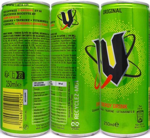 DÉCOUVREZ V ENERGY, ET SA DÉLICIEUSE RECETTE AU GOÛT UNIQUE! GUARANA+TAURINE + VITAMINES B. VENERGY, L'ÉNERGIE GOOD VIBES, ENERGY DRINK-TENEUR ÉLEVÉE EN CAFEINE, DÉCONSEILLE ANSELLE AUX ENFANTS ET AUX FEMMES ENCEINTES OU ALLAITANTES (31 MGES (31 MG DE CAFÉINE / 100 ML). Joisson énergisante gazeuse avec taurine, extrait de gode guarana et vitamines B3, 15, 86, 82 et B12, avec sucre et édulcorants, arometi aromatisée. Ingrédients : eau gazeifhée, sucre, acidifiant : acide citrique, correcteur d'acteur d'acidité: citrate de sodium, tourine 0,2%, extrait de guarana 0,12%, inositol, caféine, plocatie, glucuronolactone, colorant: E150d, arômes, vitamines B (B3, B5, B6, B2 et B12), dulcom 2), dulcorants: acésulfame K et sucralose, stabilisant: gomme xanthane. A consommer de préférer de préférence avant le : voir sur le fond de la boîte. A conserver à l'abri de la chaleur. the 250mle Commercialisé par Orangina Schweppes France. V est une est une marque de Frucor Brands International. Service consommateurs : Orangina Schweppes f Schweppes France, 595 rue Pierre Berthier CS 8049113593 Aix-en-Provence Cedex 3-France-France (indiquer la date et le numéro de lot inscrits sur le fond de la boîte). N° Cristal: 09istal: 09 69 36 32 36. Appel non surtaxé. Service valable uniquement en France métropolitaine politaine. Les vitamines B3, B5, 86, 85, 86, 82 et B12 contribuent à réduire la fatique. Latique. La caféine contribue à améliorer la vigilance igilance et la concentration. A consommer avec moderimodération dans le cadre d'une alimentation équilibrée quibrée et d'un mode de vie sain. 'Bonnes ondes 3124480"195296" M2CH24AN V2201/AL AMP DECLARATION NUTRITIONNELLE INES B. TIBES Energie Matières grasses dont acides gras saturs Glucides dont sucres Protéines Sel Riboflavine (82) Niacine (B3) Acide pantothénique Vitamines (B6) Vitamines (B12) *% de l'apport de referen adulte-type (8400 il U pas saturés 100 ml 89 kJ 21 kcal 0,25 g 0,6 mg (43%) 8 mg (48%) (85) 2 mg (33%) 2 mg (125%) 2pg (80%) art de référence pour un (8400 kJ/2000 kcal). Retrouvez les % des apports de référence sur www.suntorybfe.com/france 3 RECYCLEZ-MO 93 recyclable à l'infini ORIGINAL GUARANA ENENERGY DRINK TM RANA-TAURINE-VITAMINES B 250mle Pour 250 ml: kJ 223 52 kcal 3%* Pour 100 ml: 89 kJ/21 kcal HELLRETAIL IL