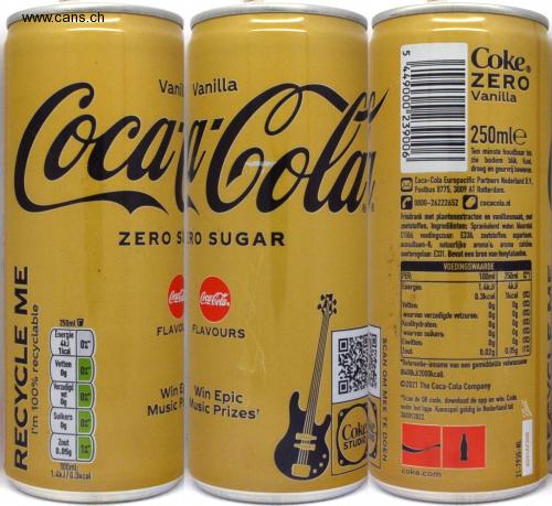 Vanil Vanilla Coca-Cola RECYCLE ME I'm 100% recyclable 250ml Energie 4kJ 0% 1 kcal Vetten Og Verzadigd vet Og Suikers Og Zout 0.05 0% 0% 0% 17 100ml: 1.4kJ/0.3kcal ZERO SIERO SUGAR CocaCo Coca-Cola FLAVO FLAVOURS Win Win Epic Music Music Prizes 0 Labe Cokele STUDIO SCAN OM MEE TE DOEN 5 449000 239006 PER Energie: Coke. ZERO Vanilla Coca-Cola Europacific Partners Nederland B.V. Postbus 8775, 3009 AT Rotterdam. 0800-26222652 cocacola.nl Frisdrank met plantenextracten en vanillesmaak, met zoetstoffen. Ingrediënten: Sprankelend water: kleurstok E150d: voedingszuur: E338: zoetstoffen: aspartaam acesulfaam-K natuurlijke aroma's: aroma cafeine zuurteregelaar: E331. Bevat een bron van fenylalanine. VOEDINGSWAARDE 250mle Ten minste houdbaar tot zie bodem blik. Koel droog en geurvrij bewaren. 100ml 250ml ) 1.4kJ/ 4kJ/ 0.3kcal 1kcal 1kcal coke.com (0 Og (02) Og (0) Vetten: Og waarvan verzadigde vetzuren: 0g Koolhydraten: waarvan suikers: Eiwitten: Og Og Og (02) Og Og Zout: 0.02g 0.05g (12) "Referentie-inname van een gemiddelde volwassene (8400kJ/2000kcal). 2021 The Coca-Cola Company *Scan de QR code, download de app en win: Code onder het lipje. Kansspel geldig in Nederland tot 30/09/2022 21-7935-NL 5G21AF208