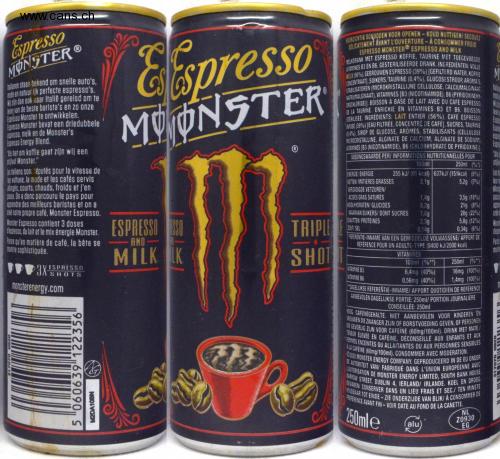 Espresso MONSTER hallanen staan bekend om snelle auto's, mode en natuurlijk perfecte espresso's. Hizin dan ook naar Italie gerelsd om te leren van de beste barista's en zo onze Espresso Monster te ontwikkelen. Espresso Monster bevat een driedubbele espresso, melk en de Monster's Espresso Energy Blend. "Als het om koffle gaat zijn wij een stillval Monster." Les italiens son. Téputés pour la vitesse de er volture, la mode et les cafés servis alongés, courts, chauds, froids et j'en passe. On a donc parcouru le pays pour apprendre des meilleurs baristas et on a crée notre propre café, Monster Espresso. Monster Espresso contient 3 doses despresso, du lait et le mix énergie Monster. Parce qu'en matière de café, la bête se montre sophistiquée. 3XESPRESSO 0260 OLOLLE monsterenergy.com 5 060639 122356 G M2DA10BN Espresso MOONSTER ESPRESSO SO AND MILK LK 7 Ⓡ TRIPLE E SHIT VOORZICHTIG SCHUDDEN VOOR OPENEN-KOUD NUTTIGEN/ SECOUEZ DELICATEMENT AVANT L'OUVERTURE-A CONSOMMER FROID ESPRESSO MONSTER ESPRESSO AND MILK MELKDRANK MET ESPRESSO KOFFIE, TAURINE MET TOEGEVOEGDE VITAMINES B3 EN B6. GESTERILISEERDE DRANK. INGREDIENTEN: VOLLE WELK (56%), GEBROUWEN ESPRESSO (39%) [GEFILTERD WATER, KOFFIE CONCENTRAAT), SUIKERS, TAURINE (0,4%), GLUCOSESTROOP, AROMA'S STABILISATOREN (MICROKRISTALLIJNE CELLULOSE, CALCIUMALGINAAT NATRIUMALGINAAT), VITAMINES [B3 (NICOTINAMIDE), B6 (PYRIDOXINEHY- DROCHLORIDE)]. BOISSON A BASE DE LAIT AVEC DU CAFE ESPRESSO, DE LA TAURINE. ENRICHIE EN VITAMINES B3 ET B6. BOISSON STERILISEE. INGREDIENTS: LAIT ENTIER (56%), CAFE ESPRESSO INFUSE (39%) [EAU FILTREE, CONCENTRE DE CAFÉ], SUCRES, TAURINE (0.4%), SIROP DE GLUCOSE, AROMES, STABILISANTS (CELLULOSE MICROCRISTALLINE, ALGINATE DE CALCIUM, ALGINATE DE SODIUM) VITAMINES (B3 (NICOTINAMIDE), B6 (CHLORHYDRATE DE PYRIDOXINE)]. VOEDINGSWAARDE PER/INFORMATIONS NUTRITIONNELLES POUR ENERGIE ENERGIE VETTEN/ MATIERES GRASSES 100ml 250ml (%) 255 kJ/ (61 kcal) 637kJ/ (151kcal) (8%) 2,1g 5,2g (7%) VERZADIGDE VETZUREN/ ACIDES GRAS SATURES KOOLHYDRATEN/ GLUCIDES WAARVAN SUIKERS/ DONT SUCRES EIWITTEN/PROTEINES ZOUT/SEL 1,49 8,2g 7,8g 2,39 0,14g VITAMINE B3 VITAMINE B6 REFERENTIE-INNAME VAN EEN GEMIDDELDE VOLWASSENE/APPORT DE REFERENCE POUR UN ADULTE-TYPE (8400 kJ/2000 kcal) VITAMINES 250ml (%) 16mg (100%) 1,4mg (100%) DAGELIJKSE REFERENTIE-INNAME/ APPORT QUOTIDIEN DE REFERENCE AANBEVOLEN DAGELIJKSE PORTIE: 250ml/ PORTION JOURNALIERE CONSEILLÉE: 250ml HOOG CAFEINEGEHALTE. NIET AANBEVOLEN VOOR KINDEREN EN VROUWEN DIE ZWANGER ZIJN OF BORSTVOEDING GEVEN, OF PERSONEN DIE GEVOELIG ZIJN VOOR CAFEINE (60mg/100ml). DRINK MET MATE/ TENEUR ELEVEE EN CAFEINE, DÉCONSEILLÉ AUX ENFANTS ET AUX FEMMES ENCEINTES OU ALLAITANTES OU AUX PERSONNES SENSIBLES A LA CAFEINE (60mg/100ml). CONSOMMER AVEC MODÉRATION. @2020 MONSTER ENERGY COMPANY. GEPRODUCEERD IN DE EU ONDER DE AUTORITEIT VAN/ FABRIQUÉ DANS L'UNION EUROPÉENNE AVEC L'AUTORISATION DE MONSTER ENERGY LIMITED, SOUTH BANK HOUSE BARROW STREET, DUBLIN 4, IERLAND/ IRLANDE. KOEL EN DROOG BEWAREN/ CONSERVER DANS UN LIEU FRAIS ET SEC./ TEN MINSTE HOUDBAAR TOT EINDE-ZIE ONDERZIJDE VAN BLIK/ À CONSOMMER DE PREFERENCE AVANT FIN-VOIR DATE AU FOND DE LA CANETTE. 250mle (alu) 3,5g (18%) 21g (8%) 20g (22%) 5,8g (12%) 0,34g (6%) 100ml (%**) 6,4mg (40%) 0,56mg (40%) NL Z0930 EG STPERCEPTION DU SI mode esore stijlv Les te leur vo passe apple Cree 317070 0920