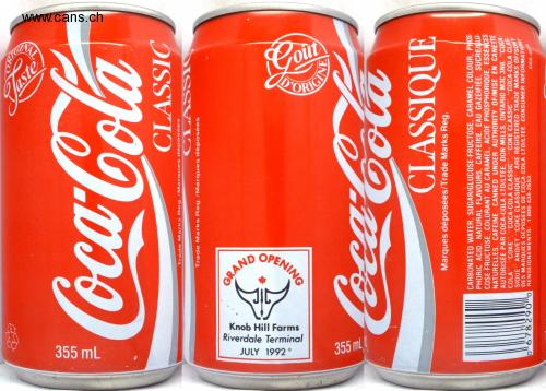 355 mL JULY 1992° Riverdale Terminal Knob Hill Farms 355 ml Coca-Cola GRAND Trade Marks Reg./Marques déposées CLASSIC CLASSIC Trade Marks Reg./Marques déposées OPENING ORI aste Marques déposées/Trade Marks Reg. Com INE Coca-Cola CLASSIQUE CARBONATED WATER, SUGAR/GLUCOSE-FRUCTOSE, CARAMEL COLOUR, PHOS- PHORIC ACID, NATURAL FLAVOURS, CAFFEINE. EAU GAZEIFIÉE, SUCRE/GLU- COSE-FRUCTOSE, COLORANT AU CARAMEL, ACIDE PHOSPHORIQUE, ESSENCES NATURELLES, CAFEINE. CANNED UNDER AUTHORITY OF/MISE EN CANETTE AUTORISÉE PAR COCA-COLA LTD/LTEE, DON MILLS, ONTARIO M3C 3N6. "COCA- COLA", "COKE", "COCA-COLA CLASSIC". "COKE CLASSIC", "COCA-COLA CLAS SIQUE" AND/ET COKE CLASSIQUE" ARE REGISTERED TRADE MARKS OF/SONT DES MARQUES DÉPOSÉES DE COCA-COLA LTD/LTEE. CONSUMER INFORMATION 0678290 ORENSEIGNEMENTS: 1-800-438-2653. CCS-2256