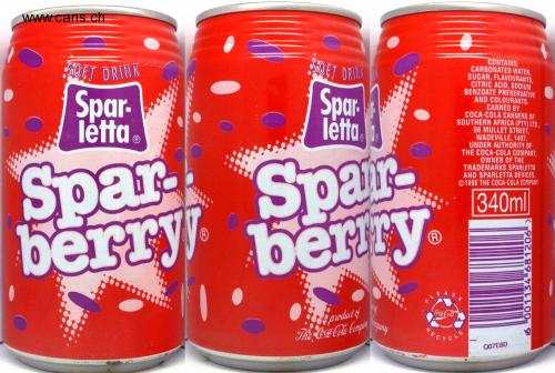 SOFT DRINK Spar- letta® SOFT DRINK Spar letta Spar Spar berry berry & product of The Coca Cola Company R PLEAS Coca-Cola CONTAINS: CARBONATED WATER, SUGAR, FLAVOURANTS, CITRIC ACID, SODIUM BENZOATE PRESERVATIVE AND COLOURANTS. CANNED BY COCA-COLA CANNERS OF SOUTHERN AFRICA (PTY) LTD., 96 MULLET STREET, WADEVILLE, 1407. UNDER AUTHORITY OF THE COCA-COLA COMPANY, OWNER OF THE TRADEMARKS SPARLETTA AND SPARLETTA DEVICES. 1996 THE COCA-COLA COMPANY E RECYCLE 340ml Q07E8D 16 001134 681206
