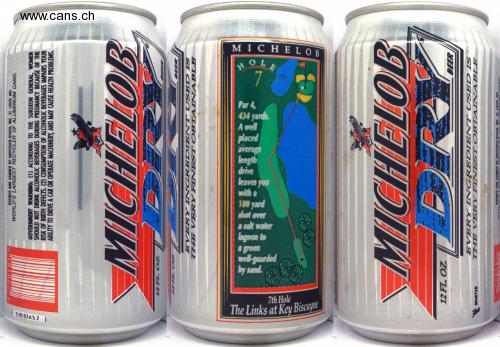 505 03 A52) 1228L8L D BREWED AND CANNED BY ANHEUSER-BUSCH, INC. ST. LOUIS, MO. WORLD'S LARGEST RECYCLER OF ALUMINUM CANS. GOVERNMENT WARNING: (1) ACCORDING TO THE SURGEON GENERAL, WOMEN SHOULD NOT DRINK ALCOHOLIC BEVERAGES DURING PREGNANCY BECAUSE OF THE RISK OF BIRTH DEFECTS. (2) CONSUMPTION OF ALCOHOLIC BEVERAGES IMPAIRS YOUR ABILITY TO DRIVE A CAR OR OPERATE MACHINERY, AND MAY CAUSE HEALTH PROBLEMS. MICHELOB 12 FL OZ 12FL OZ BEER EVERY INNGREDIENT USED IS THE VERY FINEST OBTAINABLE 7th Hole The Links at Key Biscayne MICHEL OB 7 HOLE MICHELOB DRY 12 FL. OZ. 6646738 BEER EVERY INGREDIENT USED IS THE VERY FINEST OBTAINABLE BREWED AND CANNED BY ANHEUSER-BUSCH INC ST LOUIS MO WORLD'S LARGEST RECYCLERO