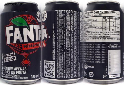 RECICLE-ME GELADA! MISTERIOSA MAIS Mistério 47% MENOS ACÚCARES* REFRIGERANTE SABORIZADO COM FRUTA 1,10% DE FRUTA CONTÉM APENAS 350 ml . SABOR MISTÉRIO. EM COMPARAÇÃO COM A FANTA REGULAR. COLORIDO E AROMATIZADO ARTIFICIALMENTE. INGR.: ÁGUA GASEIFICADA, AÇÚCAR, SUCO CONCENTRADO DE MAÇÃ, AROMATIZANTE, REGULADOR DE ACIDEZ ÁCIDO CÍTRICO, CONSERVADORES SORBATO DE POTÁSSIO E BENZOATO DE SÓDIO, EDULCORANTES ASPARTAME (12 mg) E ACESULFAME DE POTÁSSIO (5,0 mg) POR 100 ml E CORANTE VERMELHO ALLURA AC. PRODUZIDO ENVASILHADO SOB RESPONSABILIDADE DE: 1- BRASAL REFRIGERANTES S.A. CSG 06, LOTES 1 E 2 BRASÍLIA/DF, CNPJ 01.612.795/0001-51 2 - BRASIL NORTE BEBIDAS S.A. - AV. TORQUATO TAPAJÓS, 5800, MANAUS/AM, CNPJ 34.590.315/0001-58 4-NORSA REFRIGERANTES S.A. - RUA CENTRAL II, S/N° MARACANAU/CE, CNPJ 07.196.033/0021-41 5 - REFRESCOS BANDEIRANTES INDÚSTRIA E COMÉRCIO LTDA. RUA 2, QUADRA 17, TRINDADE/GO, CNPJ 03.380.763/0015-07 6- RIO DE JANEIRO REFRESCOS LTDA. - RUA ANDRÉ ROCHA, 2299, RIO DE JANEIRO/RJ, CNPJ 00.074.569/0001-00 7 - SOROCABA REFRESCOS S.A. - VIA RAPOSO TAVARES, km 104, SOROCABA/SP, CNPJ 45.913.696/0001-85 8- UBERLÂNDIA REFRESCOS LTDA. - RUA TEREZINHA SEGADAES, 45, UBERLÂNDIA/MG, CNPJ 23.814.940/0001-10 9-SPAL INDÚSTRIA BRASILEIRA DE BEBIDAS S.A. - ROD. DOM GABRIEL PAULINO BUENO COUTO, km 65,5, JUNDIAÍ/SP, CNPJ 61.186.888/0065-58. CONSERVAR AO ABRIGO DO SOL E CALOR, EM LOCAL LIMPO E SECO, AREJADO E SEM ODOR. NÃO CONGELAR. VALIDADE/LOTE: VIDE MARCAÇÃO. SACC: 0800-021-2121 NÃO CONTÉM GLÚTEN CONTEM FENILALANINA INDÚSTRIA BRASILEIRA ESCANEIE E DIVIRTA-SE. Porçã INFORMAÇÃO NUTRICIONAL Porção: 350 ml (1 unidade) Carboidratos (g) Valor energético (kcal) 100 ml 350 ml %VD 20 55 6 71 4 18 18 6,8 24 17 34 1 Apuca Açúcares totais (g) Age Açúcares adicionados (g) 4,9 Sodio Sodio (mg) Gordun Gorduras trans e Fibras alimentares. Perce Percentual de valores diários fornecidos pela Protein Proteinas, Gorduras totais, Gorduras saturadas, Não Não contém quantidades significativas de porção porção. 9-RE-REGISTRO MAPA: SP 001078-2.000111 8-RE-REGISTRO MAPA: MG 000296-8.000061 7-RE-REGISTRO MAPA: SP 000459-6.000104 6-RE-REGISTRO MAPA: RJ 000449-9.000154 5-RE-REGISTRO MAPA: GO 000311-5.000068 4-RE-REGISTRO MAPA: CE 000411-1.000138 2-RE-REGISTRO MAPA: AM 000090-6.000080 1-REG1-REGISTRO MAPA: DF 000035-3.000074 FANTA.COM.BR 23-3952571 Coca-Cola Brasil 69 D Ball JC31H10** RECICLE-ME